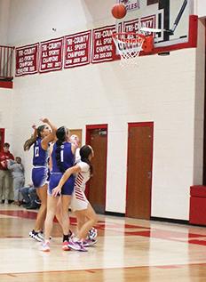 Loralei Fisher (left) puts the first points on the board for the Lady Midgets against LaPlata at the LaPlata Tournament.