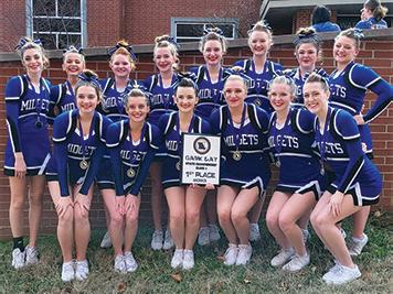 The Midget Varsity Sideline Cheerleaders with their championship plaque. Pictured are front row (L to R): Carli R., Kalyn H. (Senior), Cora H.(Senior), Shaylee V.(Senior), Makenna W.(Senior), Haven S.; back row (L to R): Allise P., Alivia R., Trinity A., Quinn W., Maci H., Gretchen D., Emily N., Kenadie D. Photo submitted by Lisa Stobbe, PC R-I Varsity Cheer Coach.