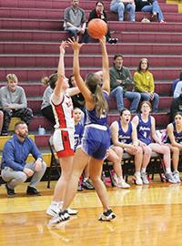Allise Perkins steps to the line and fires in district play against the Knox County Lady Eagles. Perkins led the Midget scoring with 18 points and earned