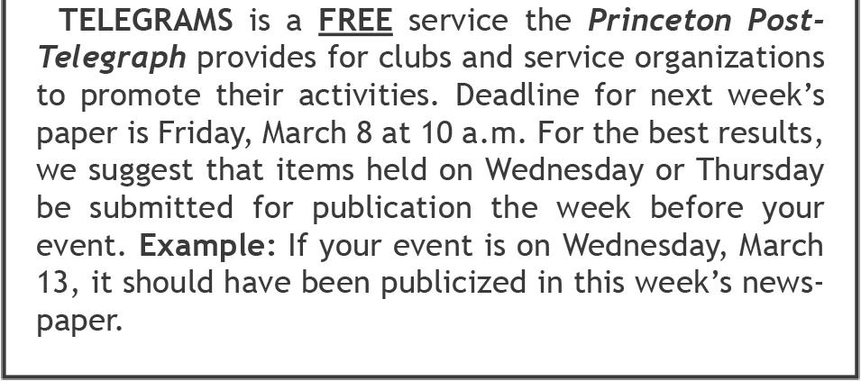 The limit of liability of the Princeton Post-Telegraph takes no responsibility for advertising, legal and/or non-legal, not published. The Princeton Post-Telegraph takes no responsibility for the non-publishing of news, letters to the editor, and/or press releases.