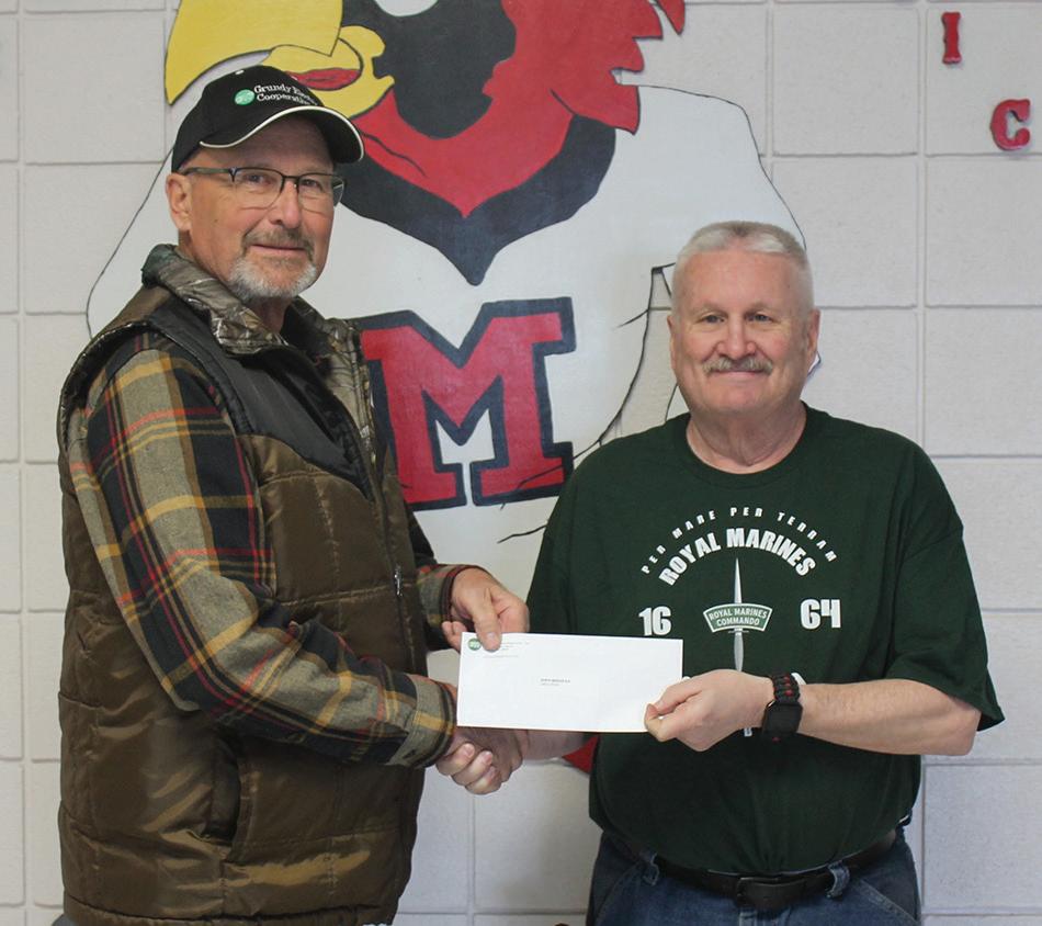 The GEC Community Foundation Inc. awarded a grant to the North Mercer R-3 School for $255 to purchase Spanish classroom materials. Foundation trustee Joe Hartley (left) presented the grant check to Greg Frost.