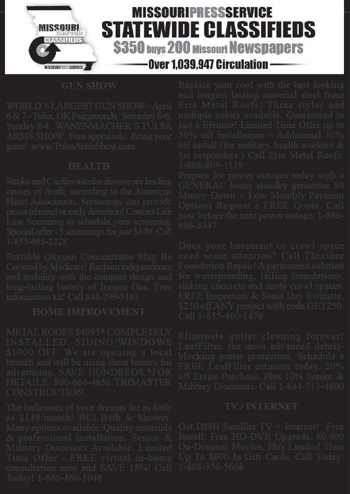 Tank Installation & Repairs •New Construction/Remodel Plumbing •Trenching & Excavating Dylan - 660-341-1305 Bryce - 660-988-0622 PLUMBING & EXCAVATING LLC Made in the USA •Lumber •Roofing •Windows •Owens Corning Insulation •Full line of Hardware ~ “Your Local Hardware Store” •Power Tools • Pole Barn Packages and House •Your one stop shop for Contractors 3301 Edison Rd. Seymour, IA 641-898-2227 Owner ~ Raymond Schwartz (Formally Miller & Sons Lumber) ■ Support Veteran Nonprofits. ■ Free Pickup & Towing. ■ Top Tax Deduction. Donate Your Vehicle Call (855) 401-4392 to donate your car, truck, boat, RV, and more today! 1. Contact Us Call (855) 401-4392 2. Schedule Pickup We’ll pick up your vehicle for FREE - at a time and place convenient for you. 3. Receive Top Tax Deduction You may qualify for a tax deduction. How it Works: Donate Your Vehicle Today 855-401-4392 While we appreciate every donation, in some cases, we find that we are unable to accept certain vehicles, watercraft, and/or recreational vehicles due to the prohibitive costs of acquisition. If you have any questions, please give us a call at (855) 401-4392. GET A FREE ESTIMATE 855-544-5286 Keep your home safe with concrete repair Worrying about your uneven or cracked concrete can make owning a home very stressful. By investing in concrete repair, you can fix your driveway, walkways, patio, and more in one easy lift. BEFORE AFTER PRECISE REPAIR, GENUINE CARE Receive a free 5-year warranty with qualifying purchase* - valued at $535. Call 660-240-0832 to schedule your free quote! Thunderhead Mowing Unionville, MO Starting April 2nd Residential Commercial Free Estimates No Contracts • Insured Accepting NEW Customers Call Tom @ 660-211-9668 United Tree Service Centerville, IA Free Quotes call Jose Guajardo 385-302-4754 Tree Trimming, Stump Grinding, Tree Removal, Tree Pruning Storm Work - 24/7 ~