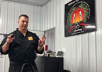 Sensei Justin Simmons, Midwest Martial Arts, hosted a gathering of Unionville Rotary members at his business on W. Main. Photo credit: Mary Comstock