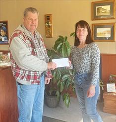 Gary McCloud, volunteer for the Food Bank for Central and Northeast Missouri Buddy Pack program is shown presenting a donation from the United Women in Faith of the United Methodist Church to Mary Frank for the local program.