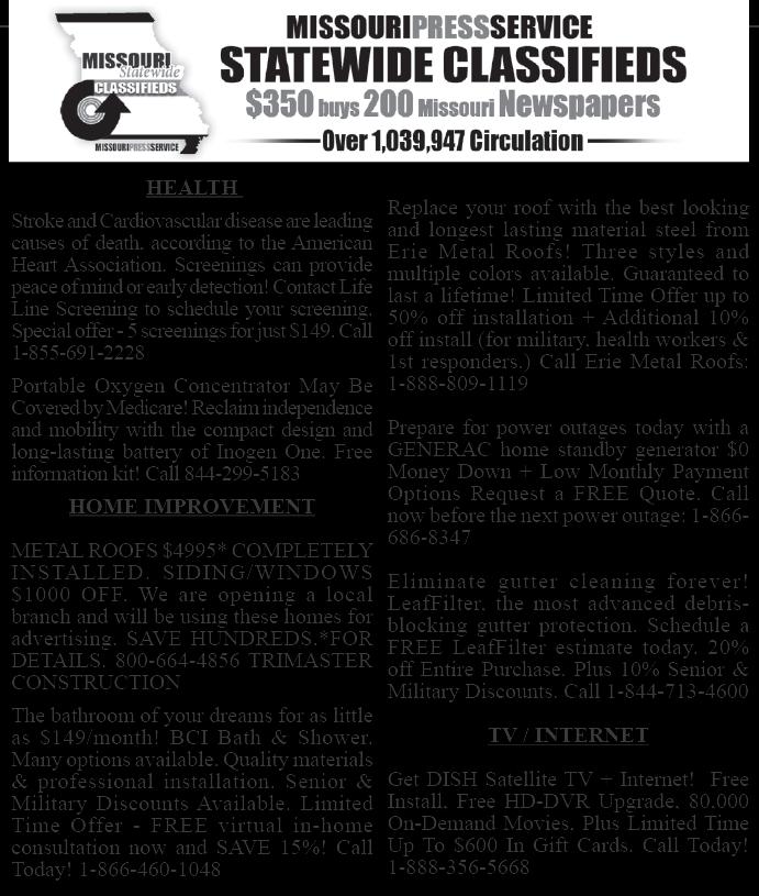 Page 10, April 24, 2024, The Unionville Republican $5.00 for first 15 words 25¢ per word after 15 All Classifieds Pre-Paid unless account exists Deadline is Friday at 12:00 p.m. Noon Unionville Republican Classifieds www.unionvillerepublicanonline.com KV Excavating • Land Clearing/Dirt Work • Ponds & Structures • Basement and Slab dirt work • House Demolition Bryce Koenen, 660-988-4921 Nickolas VanGenderen 641-895-7800 3-20-4tc AP ROLL-OFFS Commercial & Residential 15 & 20 Yard Dumpsters. Portable Storage Austin Peters 641-856-9988 aprolloffs1@gmail.com 8-23-tfn Dave’s Tire Shop We have a Credit Card Machine! Now offering Computer wheel balancing, Tire sensor repair & replacement & New and used tires. 660947-7007. OPEN SAT. 7am-2pm. 8-23-tfn Altiser Auction & Appraisal Taking Consignments Buying Estates - Coins 660626-4960 7-17-tfn Seaton Excavating & Basements For all your concrete & dirt work needs. Call Kevin 660-216-2423 tfn Notice: The Unionville Republican is offering U.S. American Flags. There are 3’x 5’~ 4’ x 6’ ~ 5’ x 8’ Heavy Nylon and are purchased through the American Legion. Now Available at the Unionville Republican Made in the U.S.A. SELL IT IN THE CLASSIFIEDS Only $5 for 15 words For Rent 3 bedroom Townhomes. Help with utility deposits. Rent based on income North Valley Townhom.s 1604 N. Valley Lane, Unionville, MO 63565 660-947-3623 4-10-tfn Unionville Estates One Bedroom apartments accepting applications, Unionville Estates. HUD vouchers accepted, rent based on income. Equal Housing Opportunity Call 660-947-3804 3-18-tfn For Rent: 2 bedroom house. 1724 Monroe, Unionville. $475 rent plus deposit. Call 641-919-4147 3-20-tfn FOR SALE Purebred Angus Bulls READY FOR FALL BREEDING 12-20 month old Medicine Oaks Farms William H. Godfrey Powersville 660-592-2626 660-626-7892 Rouse Heating & Cooling 660-216-9959 Electrical, Plumbing, Trenching and Backhoe Service. Sell & Install AIREASE furnace and A/C. Fujitsu mini-split heat pumps Jason Rouse, owner 11-18-tfn Dennis’s Small Engine Repair & Service Dennis Kroemer - Owner Service and parts for most small engines. Interstate Battery Dealer Debit/Credit Accepted. 27051 226th St. Unionville, MO. 660-3442254 - Cell: 785-294-8059