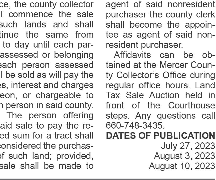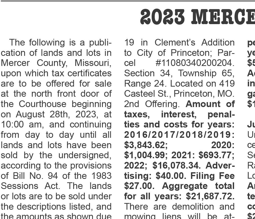 THE ONLY COMPLETE SOURCE FOR MERCER COUNTY NEWS AND SPORTS INFORMATION! Classified Ads --- 2 News ----- 2, 4-11 2023-24 PRINCETON, MERCER SCHOOL SPORTS SCHEDULES - 12 75¢ MC Commission 2 Opinion ---------- 3 Obituaries ------- 7 Christy’s Kitchen 10 Volume 151, No. 32 - Princeton, MO 64673 Thursday, August 10, 2023 FIND THIS INFORMATION AND MORE IN THIS WEEK’S PRINCETON POST-TELEGRAPH
