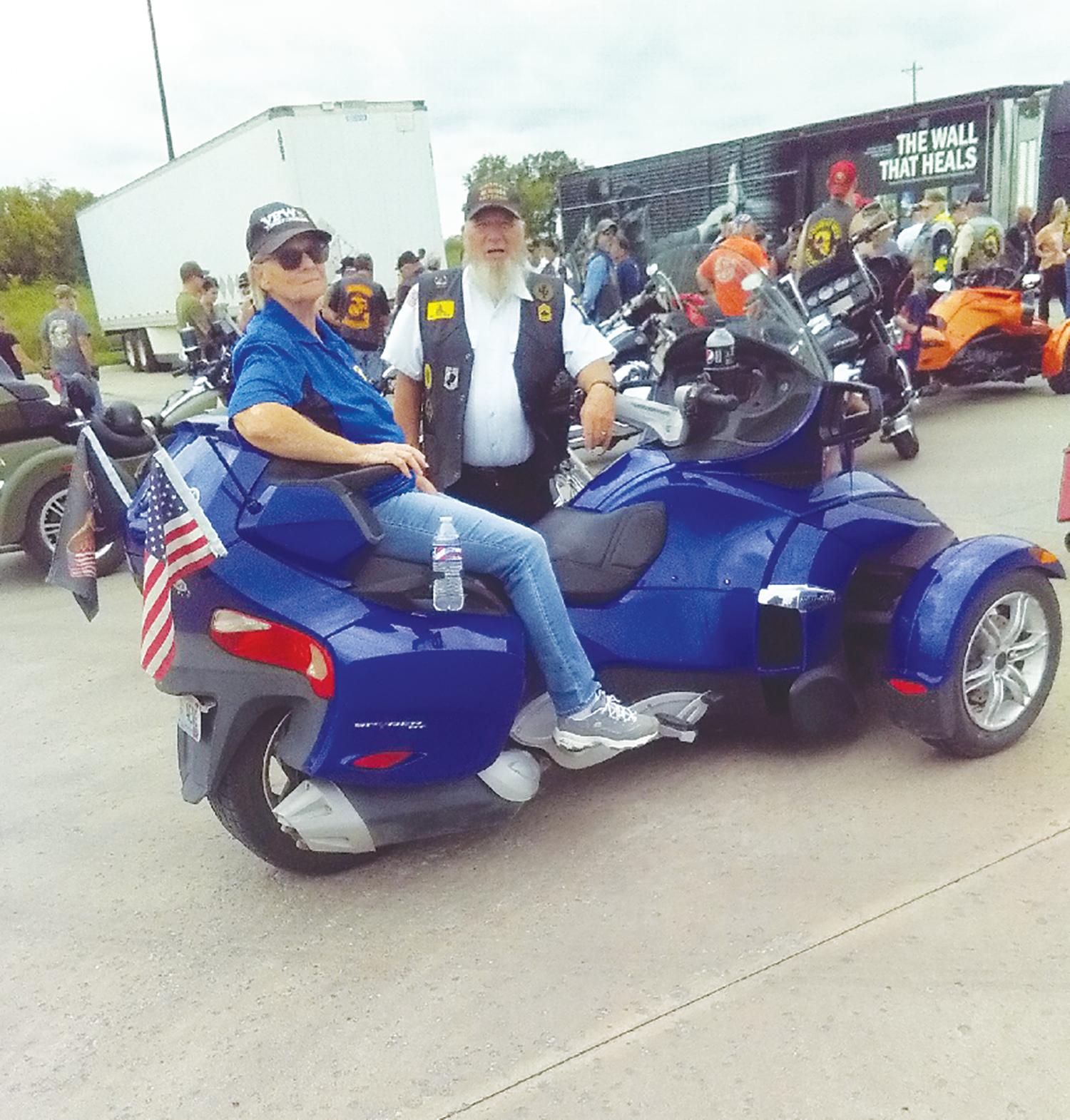 Ruth Ann Shipps (seated), commander of Princeton VFW Post 7159, rode on Jim Dusenbery’s Can-Am style motorcycle as numerous veterans escorted “The Wall That Heals” into Chillicothe last Tuesday, Aug. 1. The wall is a 3/4-scale version of the Vietnam Veterans Memorial and features the names of every U.S. service member that was killed in Vietnam or Southeast Asia during the Vietnam War, or remain missing. The wall’s appearance at the Chillicothe High School sports practice field drew thousands of visitors during its stay during the second half of last week.