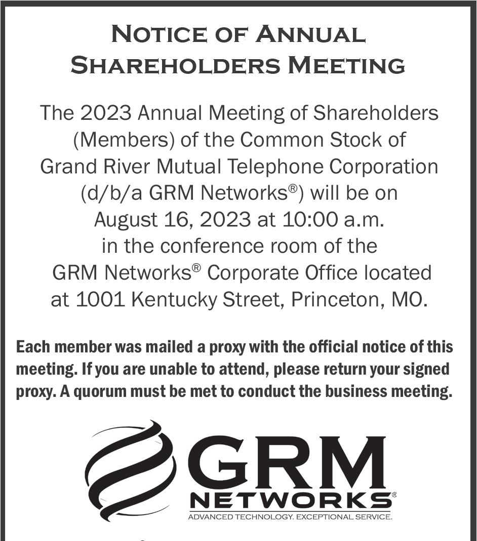 The 2023 Annual Meeting of Shareholders (Members) of the Common Stock of Grand River Mutual Telephone Corporation will be held at 10 a.m. on Wednesday, August 16, 2023, at the GRM Networks® Corporate Office located at 1001 Kentucky Street in the City of Princeton, County of Mercer, State of Missouri, to take action upon the following matters: