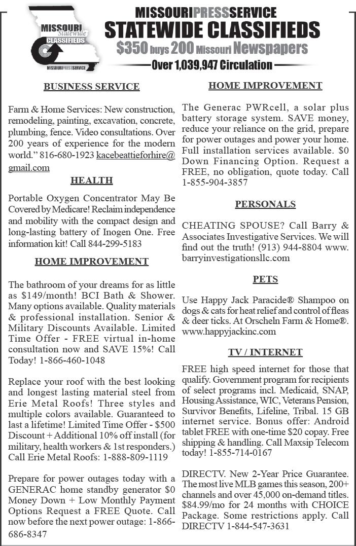 The Drought Assessment Committee will meet at 10:30 a.m. Oct. 4, in the LaCharrette/ Nightingale conference rooms of the Lewis and Clark Building, 1101 North Riverside Drive, in Jefferson City. The meeting is open to the public and will also be livestreamed via Webex at stateofmo.webex. com/stateofmo/j.php?MTID=m17bd72ce8afc9a06d8ae83ea4eb8a941.