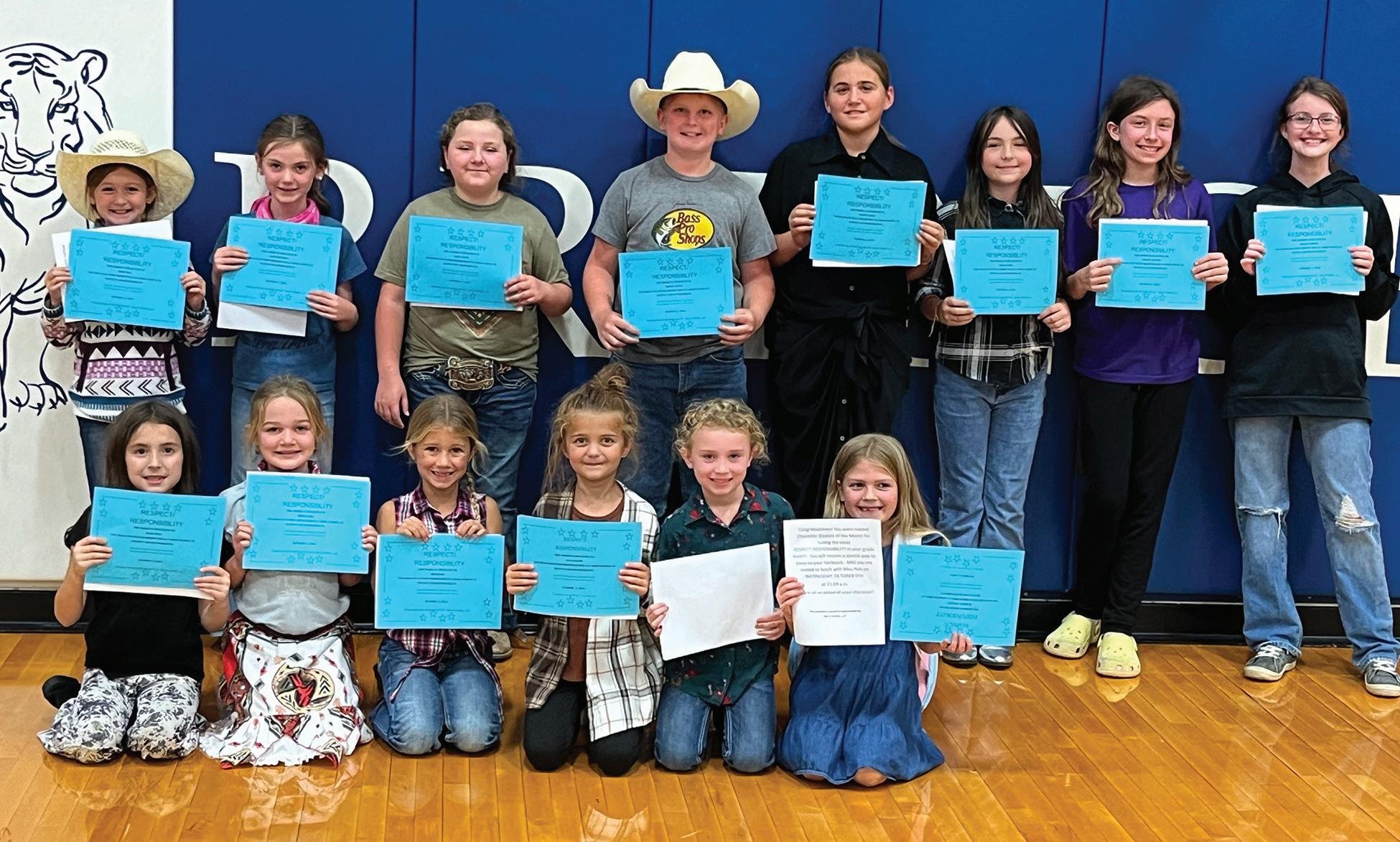 Students receiving the character trait awards, from left: FRONT - Ellena Daly, second grade; Marlo Holt, first grade; Mya Davis, second grade; Ella Felder, kindergarten; Styrling Claycomb, kindergarten; Blakeley Guilkey, first grade; BACK - Madison Holt, third grade; Lucy Radewald, third grade; Halle Allen, fourth grade; McCrea Kelly, fourth grade; Stella Easter, fifth grade; Rani Tudeen, fifth grade; Kinsley Collins, sixth grade; Kenley Lowrey, sixth grade.