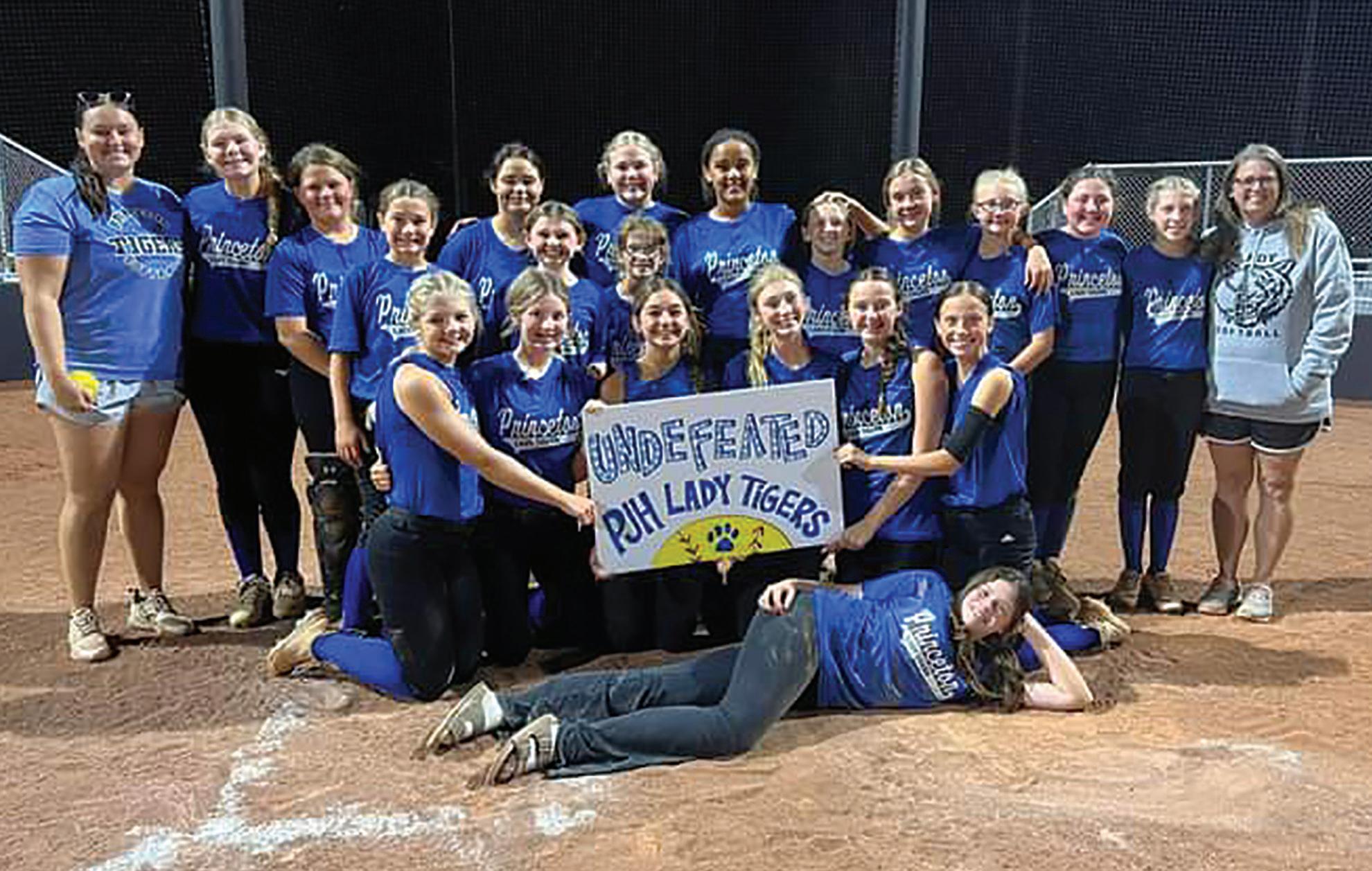 Mary Jane Renfro missed hitting for the cycle by a home run. Zoe Fisher hit a pair of doubles, and Ainsley Cowan and Maizy Allen each hit ground-rule doubles. Princeton finished with an 18-0 record. A team photo appears on Page 1. Princeton’s “B” team ended its season with a 9-0 victory over Gallatin. Dreamy Staten hit a double for the young Tigers, who finished with a 6-5-1 record.