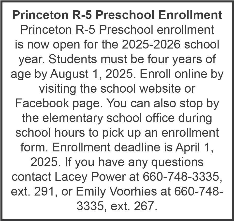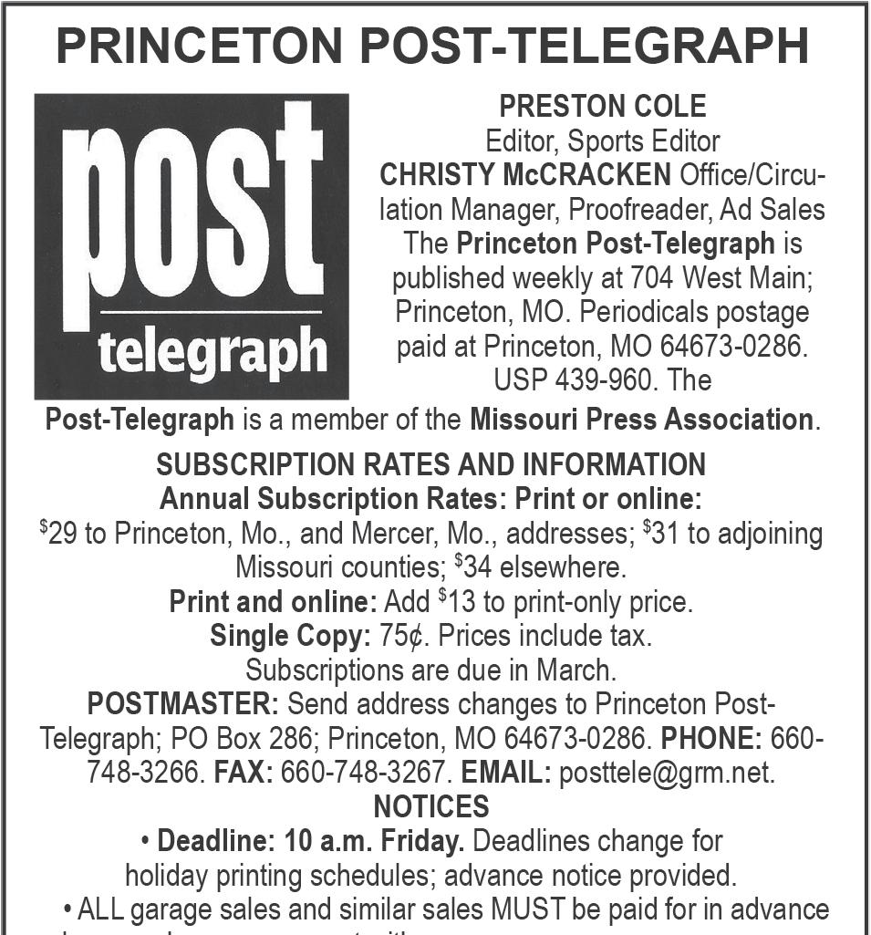 CORRECTIONS & CLARIFICATIONS The Princeton PostTelegraph strives for accuracy and fairness in all of its news stories and photo captions. If you feel we have made an error, please contact us at 660748-3266 or posttele@ grm.net (email) to request a correction. If it is found we are in error, we will be happy to publish a correction or clarification.
