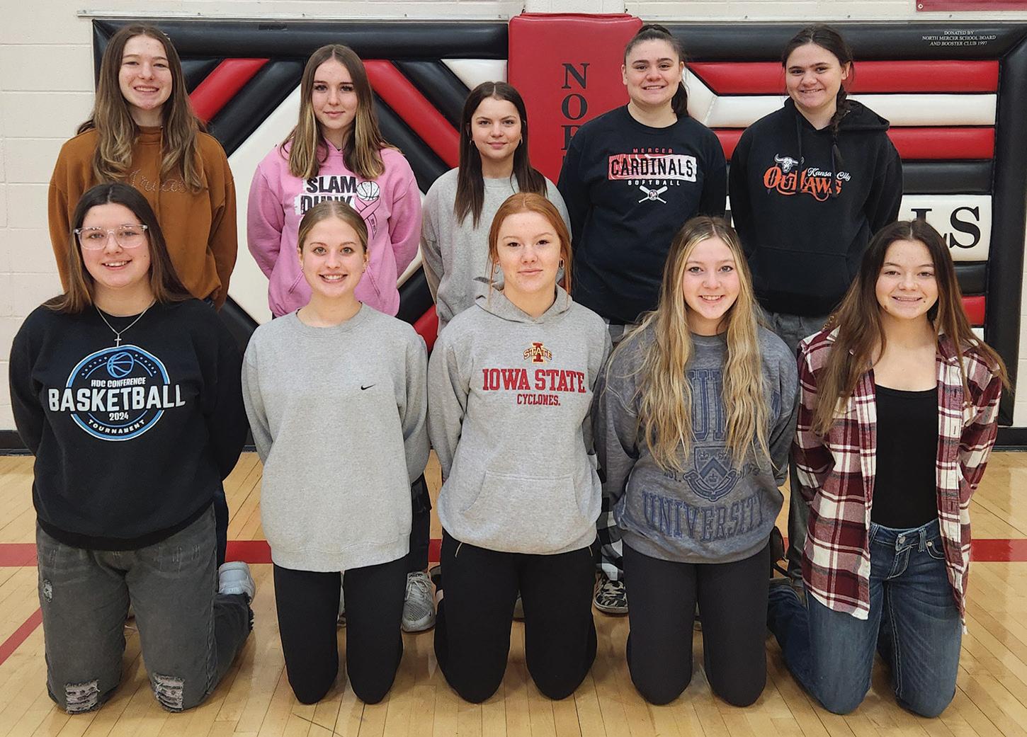 These Mercer student-athletes were named to the Class 1 Fall Academic All-State softball team. From left: FRONT - Linda Barton, Makenzie Hagan, Danica Hobbs, Kylie Cowles and Riley Stark; BACK - Kylie Holt, Kennedy Vincent, Payton Davis, Sari Rogers and Kali Rogers.
