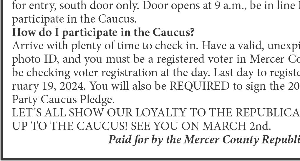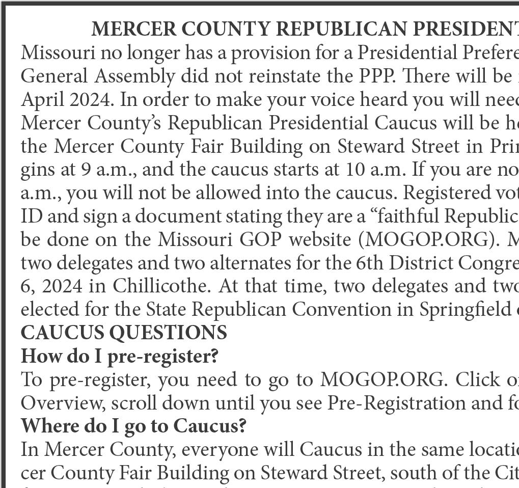 Several political offices are up for election in Mercer County this coming November, including 1st District commissioner, 2nd District commissioner, sheriff, collector/ treasurer, assessor, public administrator, coroner, and 3rd Circuit Court judge (Grundy, Harrison, Mercer and Putnam counties)