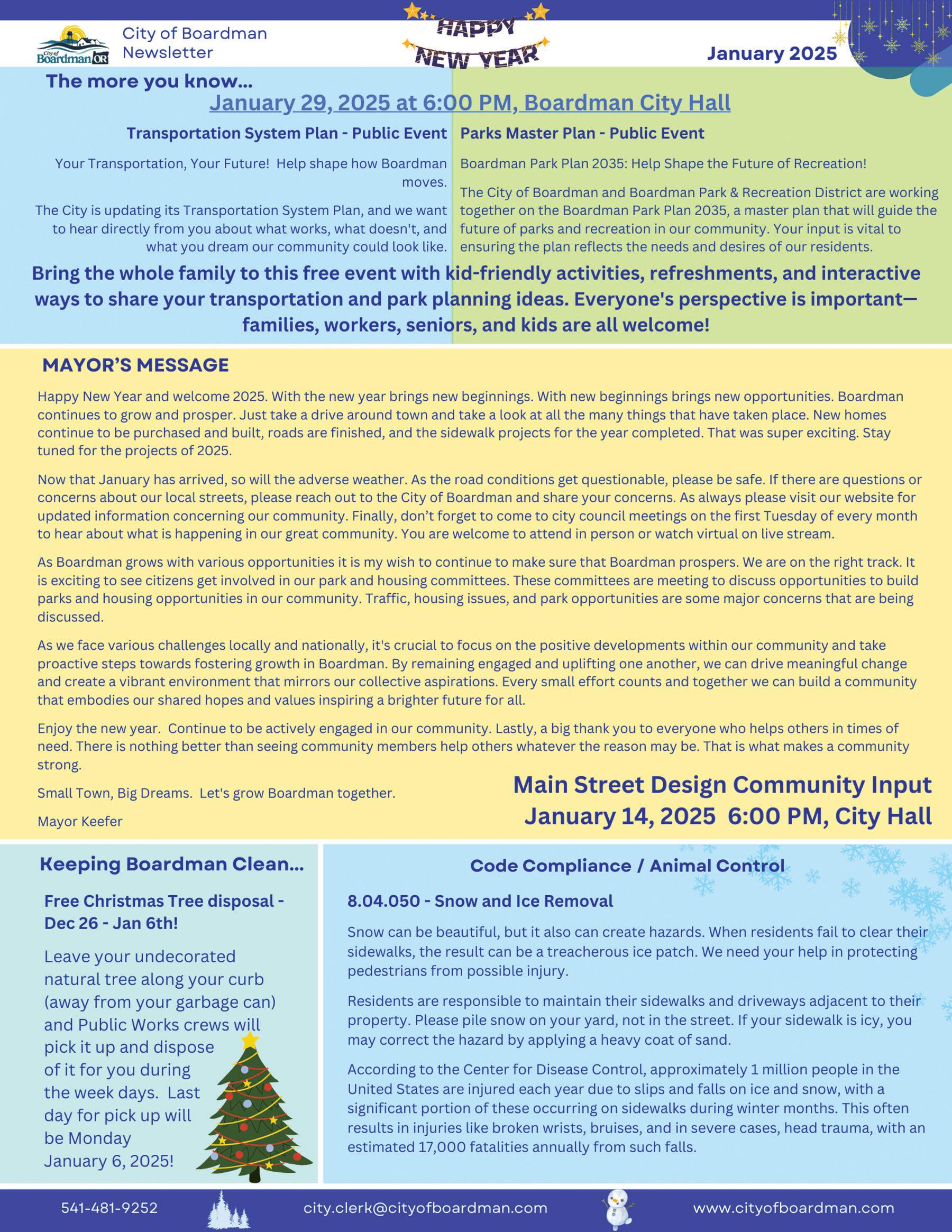 The City of Boardman would like to invite you to join us on January 14th at 6:00 PM at City Hall for a meeting regarding the upcoming project on South Main Street. Citizens will have the opportunity to review and provide input on some of the decorative pieces of the design. We look forward to seeing you!
