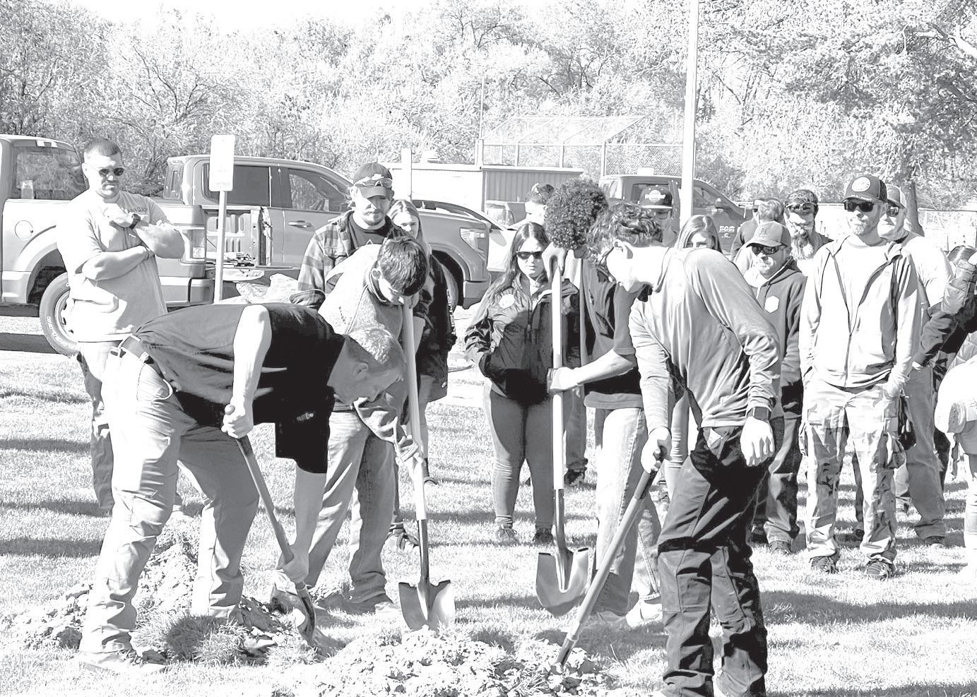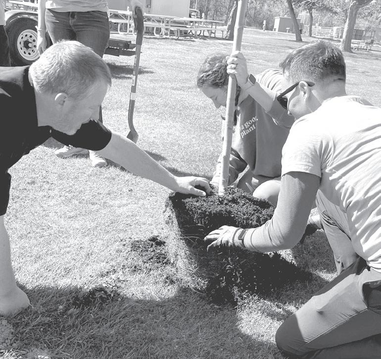 the funds to purchase trees, supplies for the trees and supplies for the day’s event. Approximately 35 AWS workers, a representative from ADF, and 11 BPRD workers showed up at 8:30 in the morning. 60 trees showed up in the back of a semitruck that morning along with more headed to Hermiston and Pendleton with other stops on the way to Salt Lake City. All these trees were in 15-gallon containers. The trees averaged 11-13 feet in height with some reaching 15 feet. Most were varieties of Maple trees, with some Lindens, Elms and one Tulip tree.