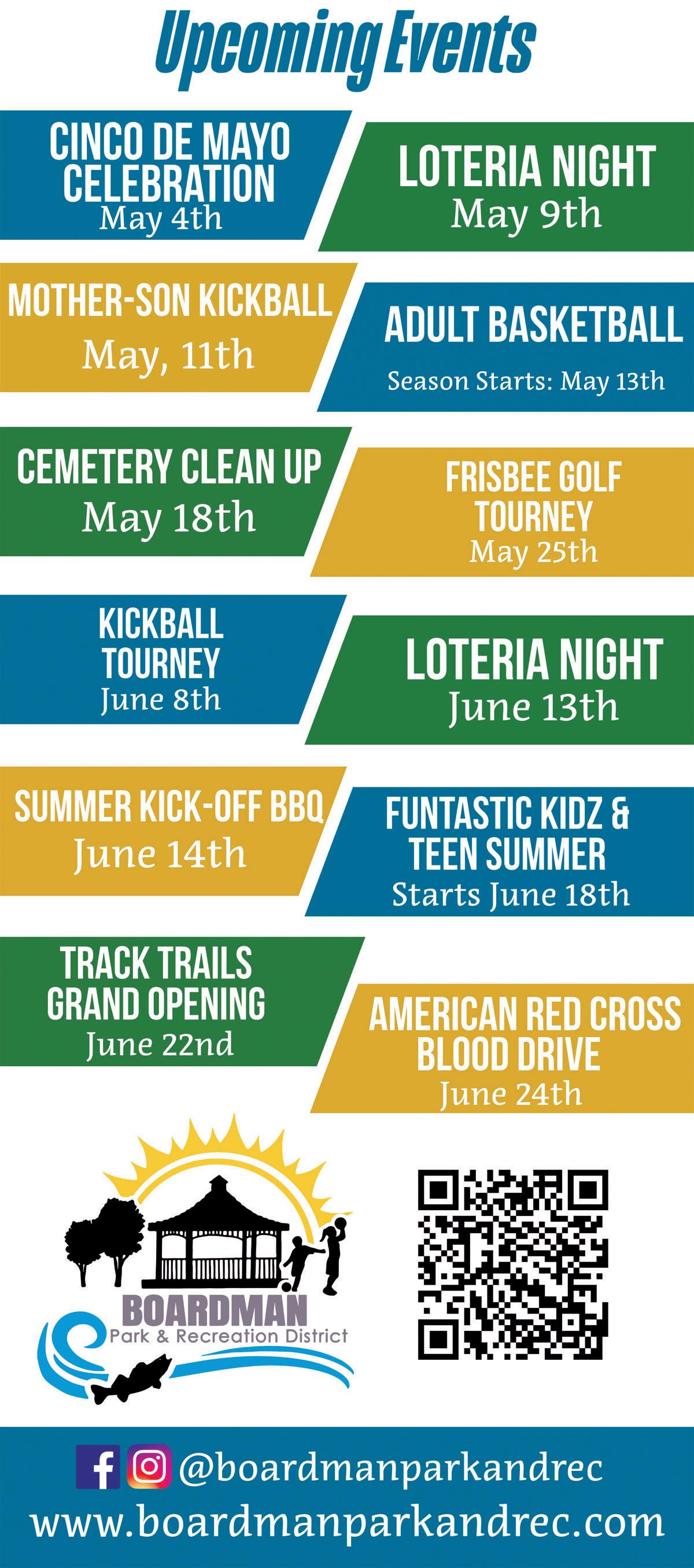 A big change this year will be for the Teen Summer program. Students from incoming 7th grade to incoming seniors will get a chance to choose from a variety of camps: cooking and baking camp, wilderness survival camp, robotics and model rockets camp, reality show challenge course camp, and sports camp. Check in with the Boardman Park & Recreation District web site or social media pages for more information on this as well as other upcoming events.