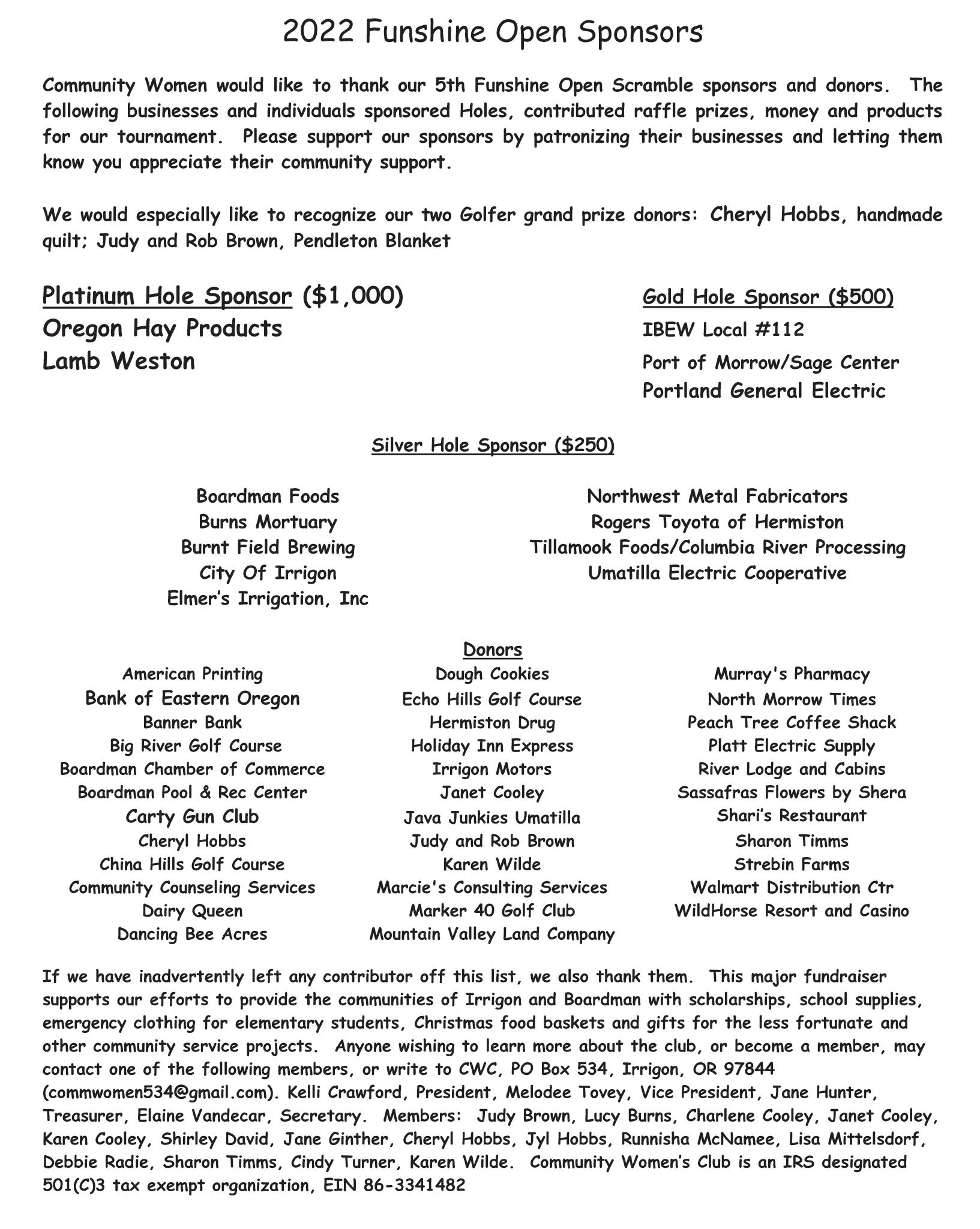Community Women’s Club wishes to thank all the hole sponsors, raffle donations, silent auction item, quilt and blanket donors and teams. Monies are given back in our communities to support scholarships at both Riverside and Irrigon High for students furthering their education at a