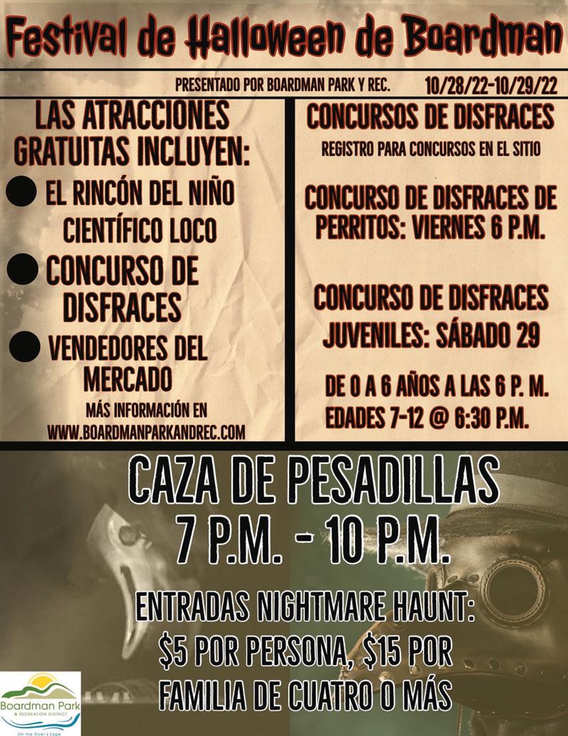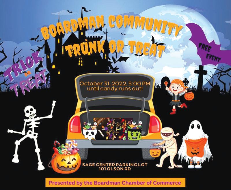 Oct. 24 - Adult Art, 5:307:30 pm. Oct. 28 & 29 - Halloween Festival - 5:00 - 10:00 pm. Visit boardmanparkandrec.com for more information.