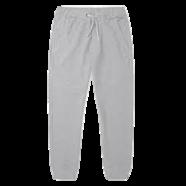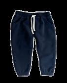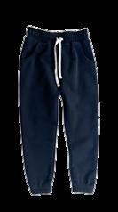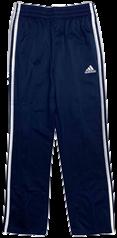Navy or grey track pants, chino joggers, or shorts. Pants may have thin vertical white stripes on the sides and a small emblem (no larger than 1").