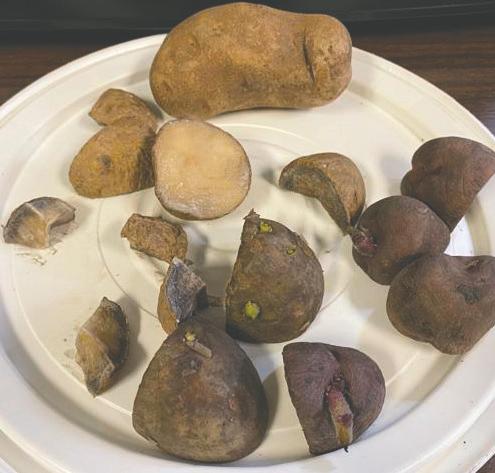 Cut each seed potato into 1 ½ - 2-ounce chunks (with each chunk containing 2-3 eyes) and allow them to heal 7 days in a dark, humid area before planting. This allows the gardener to produce several plants from one tuber, and the healing steps allow each “seed” to harden off, creating a protective callous that keeps out unwanted fungi and bacteria. Potatoes can be planted anytime from midJanuary through the end of February. Space plants 12 inches apart and cover with soil. Potatoes plants mature around 2 ft tall and 1 ft wide. After 90 to 120 days, plant growth slows and turns light green/ yellow. That’s the visual cue to let the gardener know when to begin harvest