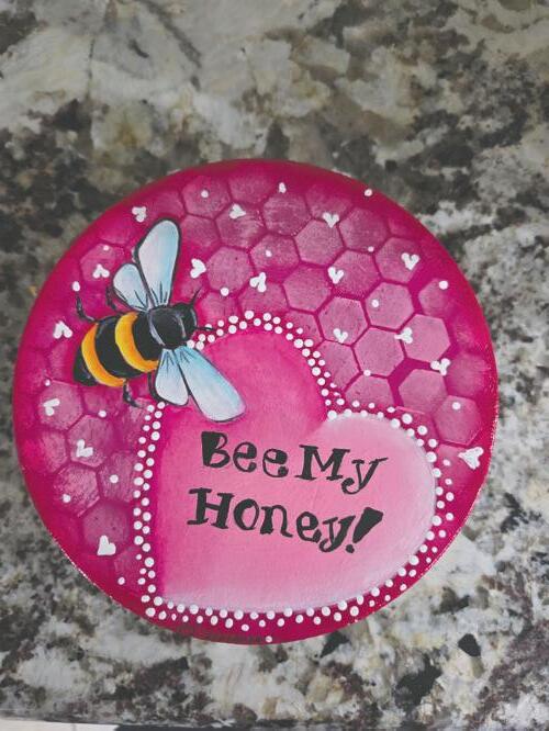 This year Valentine’s Day is just a few days before Mardi Gras so I decided to paint something to hold those sweet treats. At first I was going to paint a wooden heart. But while I was looking for those I happened to find a glass bowl with a wooden top. What better gift for someone than a hand painted container filled with sweet treats? I thought this would be perfect! I had to sand the wooden top quite a bit to get the varnish off so the paint would adhere to the surface better. Then I base coated the surface with Fuschia Pink when dry, I stenciled on the honeycomb pattern, traced on the design, painted the bee first, then the heart. Free handed the lettering, I am still practicing on that. Did the dip dots around the heart and decided it didn’t look “finished”. I added the dip dot hearts and regular dip dots and like it a lot better. This is going to make a nice conversation piece.