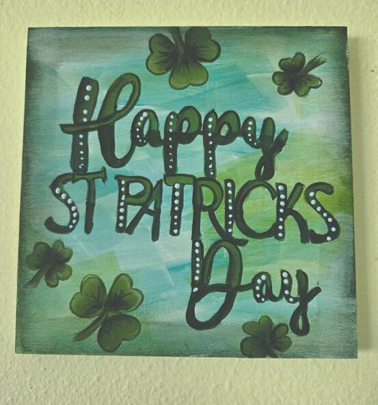 Since St. Patrick’s Day is so close, I decided to paint a St. Patrick’s Day piece. This is painted on a 6 X 6 cradle board which you can stand on alone on a shelf or table or hang on the wall. I first base coated the board white. When the paint was dry I slip slapped three different colors of paint in various places with the same “dirty” brush. I then added the letters and shamrocks. I base coated the letters with sage green. When dry I painted the bottom of the letters with Dark Hauser Green and the top with Leaf Green. Did some shading on the letters and dip dots. The shamrocks were painted leaf green and shaded dark hauser green. Shaded the outside edge with the dark green.