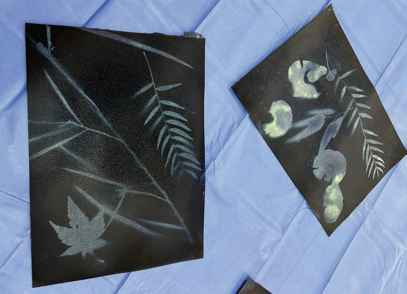During Weeks 8 and 10, students learned about Sun printing. Students explored the science behind the magic of the Cyanotype process and learned the foundation of photography which involves using chemistry to create a lightsensitive solution that when exposed to light causes a chemical reaction. Students used the chemical solution to turn the paper “light sensitive”. They made what is referred to as a cyanotype by collecting materials from outside the classroom, and then laying them onto the light-sensitive paper. They then exposed their compositions to the light and watched how the sunlight “develops” their pictures by turning exposed areas blue, when rinsed with water, the unexposed areas are turned to a different colour (the original colour of the paper). These masterpieces were from my Year 7/8 Advanced Science class.