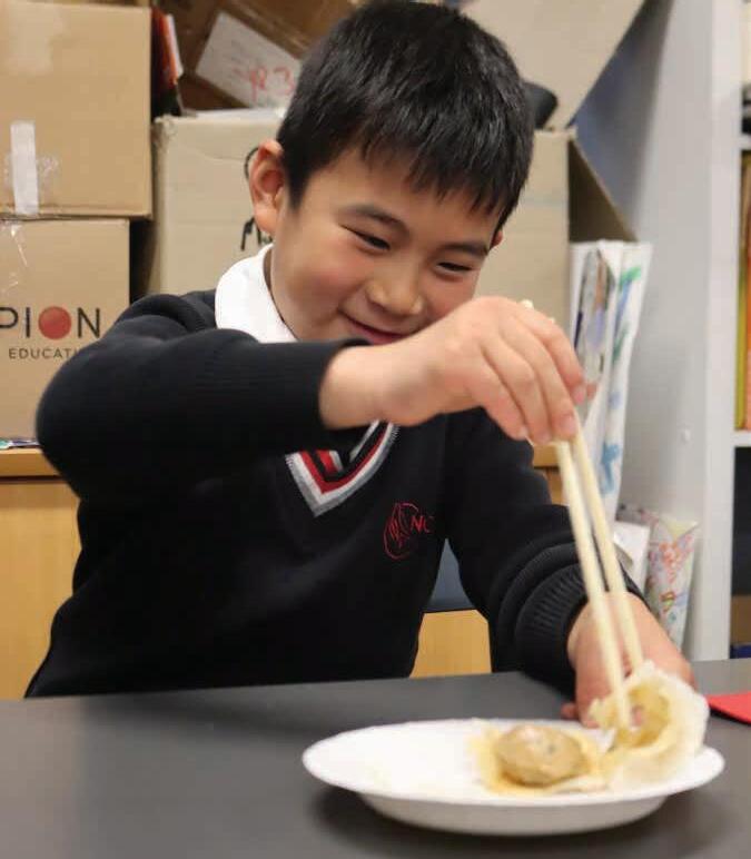 As part of our Year 2 Chinese curriculum we have been exploring Chinese cuisine ( ) and learning about the different food and drinks. To mark the conclusion of this unit we have decided to taste and eat some of these foods from a restaurant down the street. It was a feast of many kinds of dishes including noodles, fried rice, chicken wings, dumplings, steamed and fried buns.