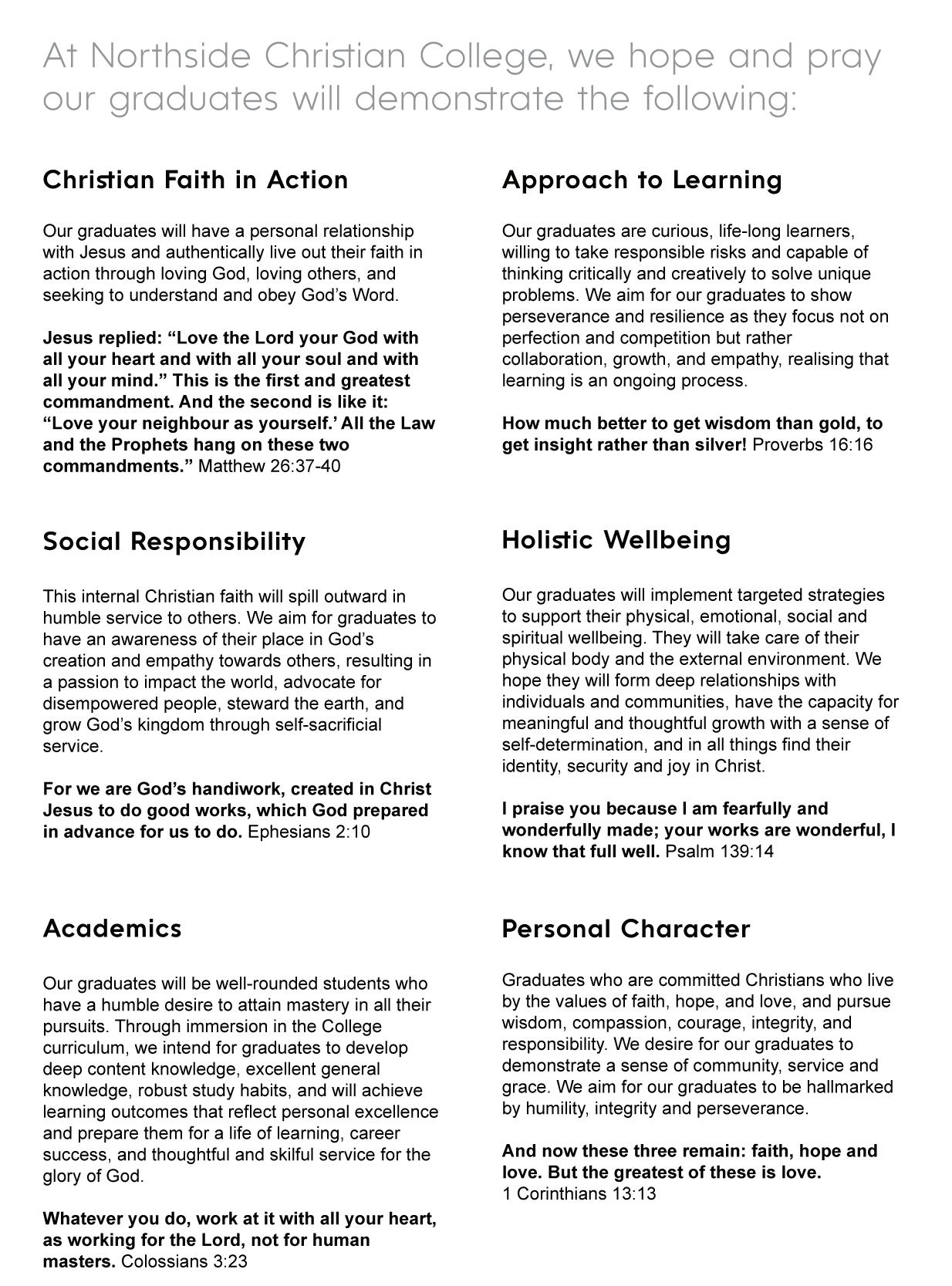 Over the course of several years, and with input from College families, we have developed the Northside Christian College Portrait of a Graduate. This document is an articulation of the qualities that we hope our students will possess after completing their learning at the College.