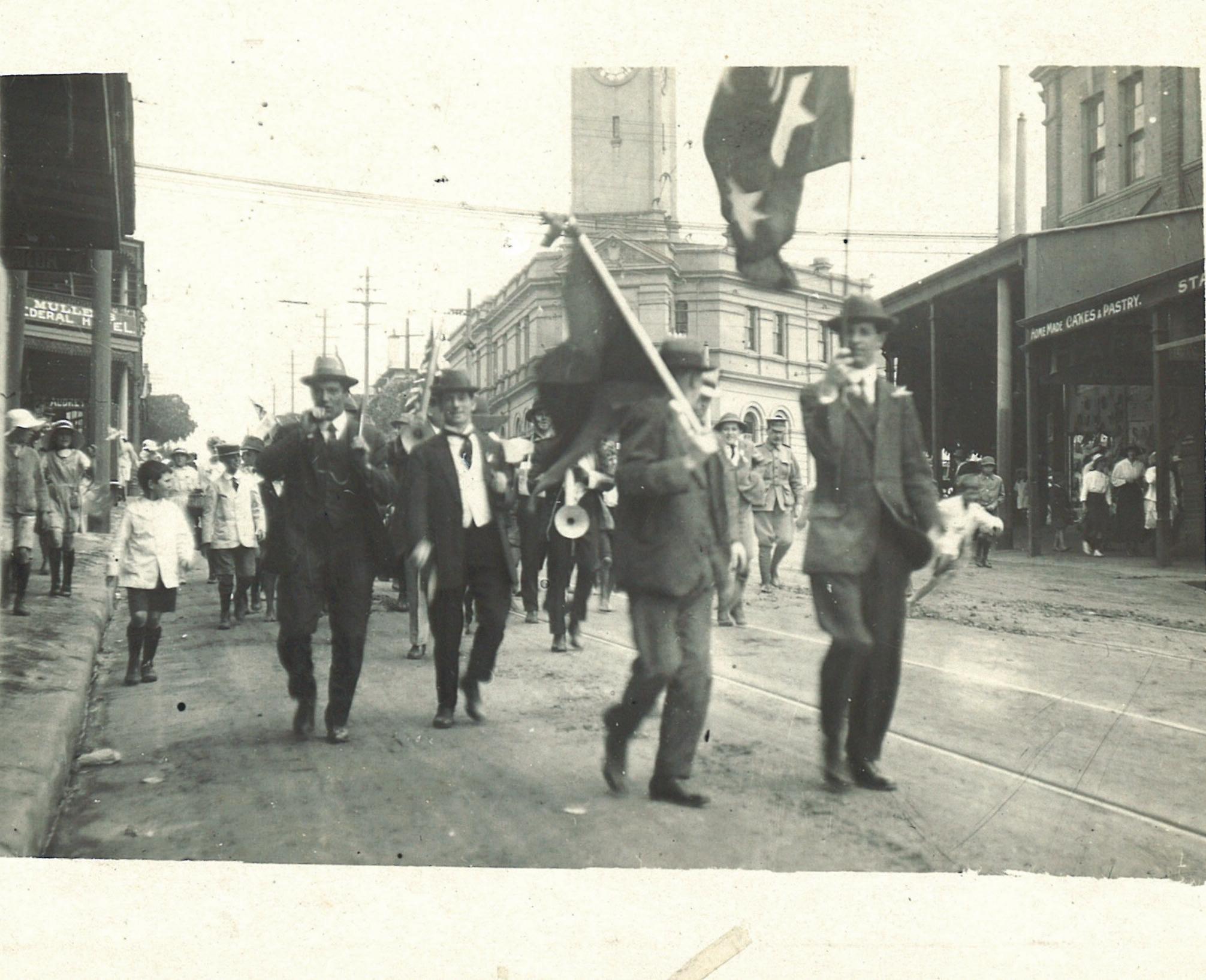 Taking place along the main shopping street, British flags were waved, a band was quickly organised and speeches were made on the steps of the Post Office, which can be seen in the background of this photo looking very much the same as it does today. While ANZAC Day 2021 might be marked a little differently due to Covid regulations, take some time to reflect and remember on the 25th April. Lest we forget. l