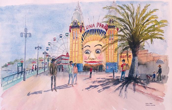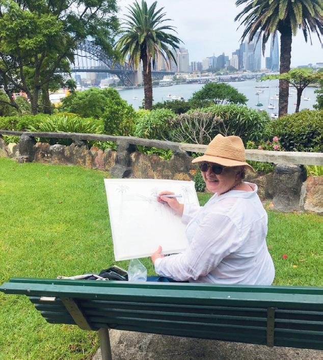 far left: Julie Keech with her artwork at the RNSH; some of her pen and wash works from the ‘Iconic Sydney’ collection. Above right: At work in Clarke Park.