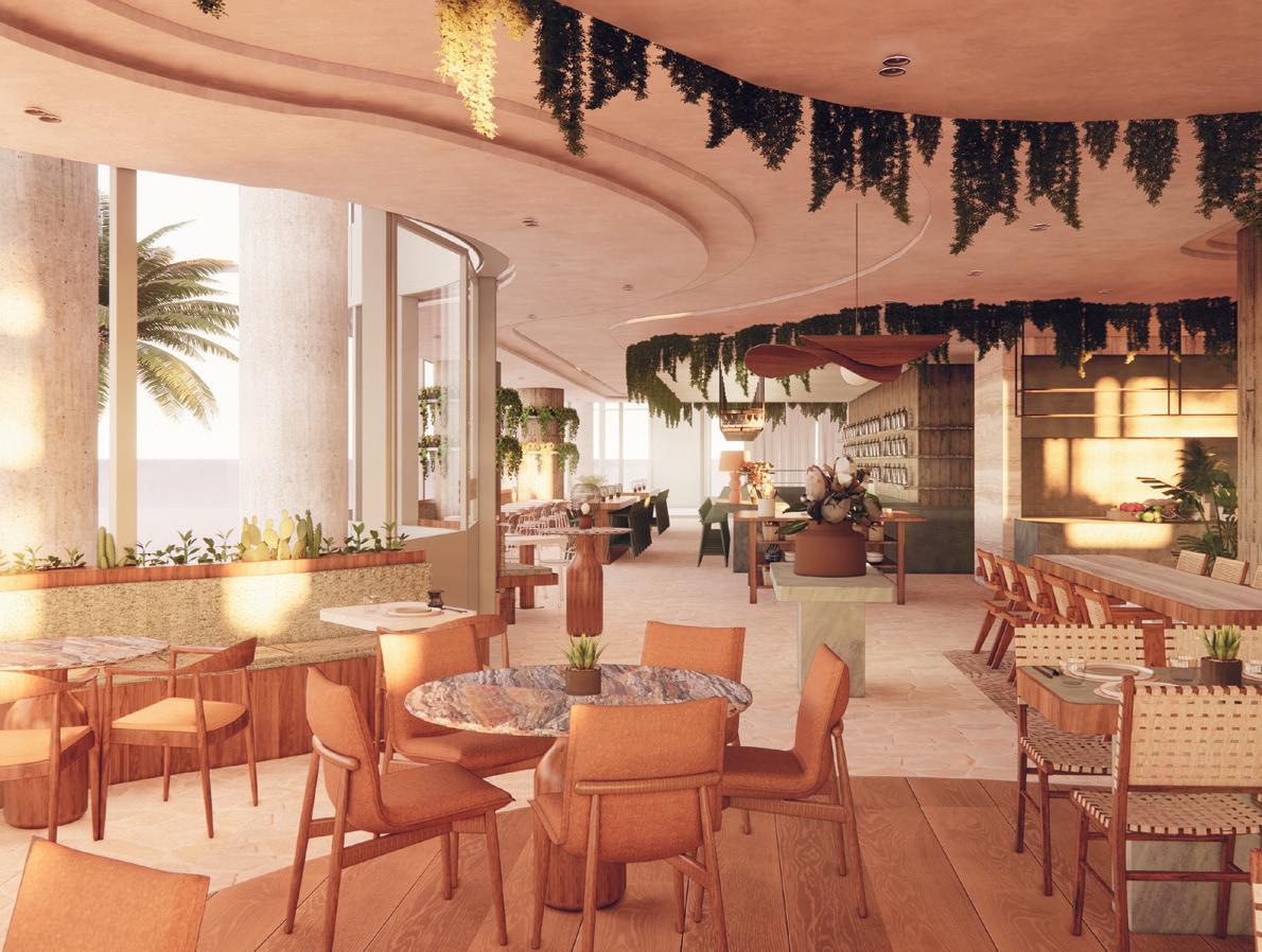 The all-day diner inspired by LA living at AURA by Aqualand, right; the project’s bakery, café and wine bar with alfresco area for drinks and dining, below.