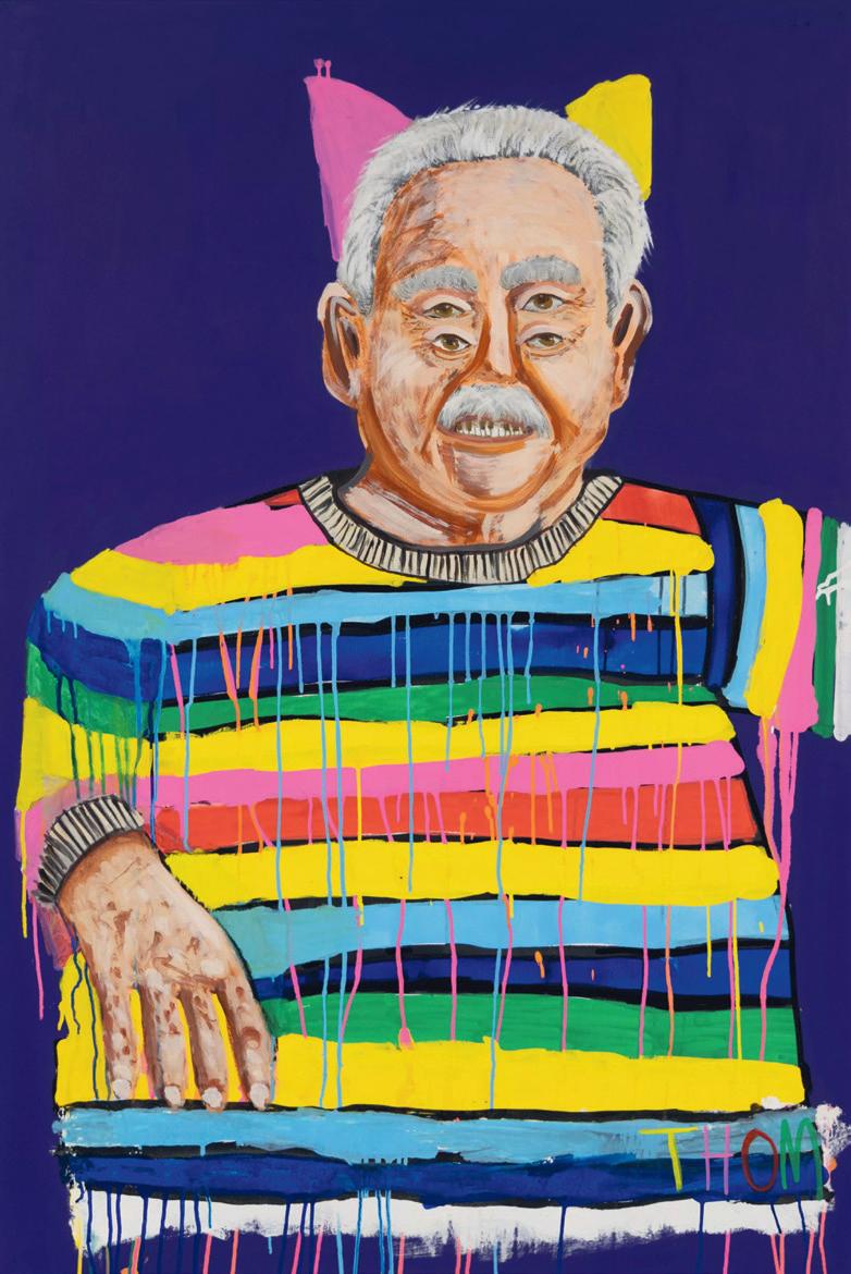 His distinctive paintings have been widely exhibited, from appearing at Carriageworks, which Thom calls his “Giant Castle”, where his work made up a major part of The National: New Australian Art in 2019, to the Archibald Prize, where four of his portraits have been shortlisted. The most recent piece selected as a finalist featured fellow