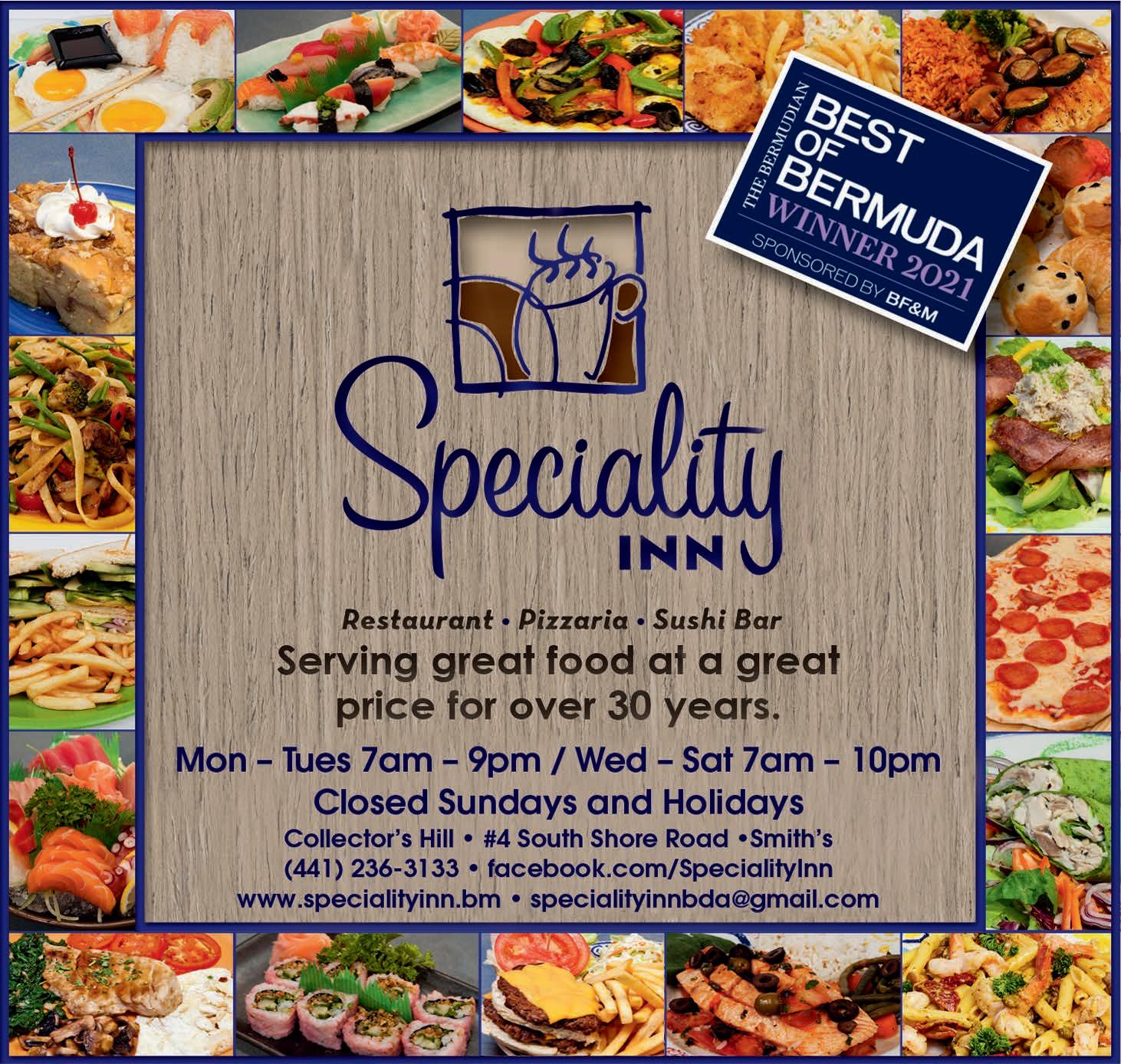 Established in 1985, Speciality Inn is Bermuda’s favourite local restaurant and a multiple-time “Best of Bermuda” award winner. Known for its range of local and international cuisine, this family-owned restaurant also boasts a pizzeria and sushi bar. Kid-friendly, with a welcoming yet relaxed ambience, Speciality Inn has built a reputation for excellence in food and customer service. Whether it’s to dine in or take out, stop by for breakfast, lunch, or dinner. They are open Monday and Tuesday from 7 a.m. to 9 p.m., Wednesday through Saturday from 7 a.m. to 10 p.m., and closed Sunday and public holidays. Reservations are not required.