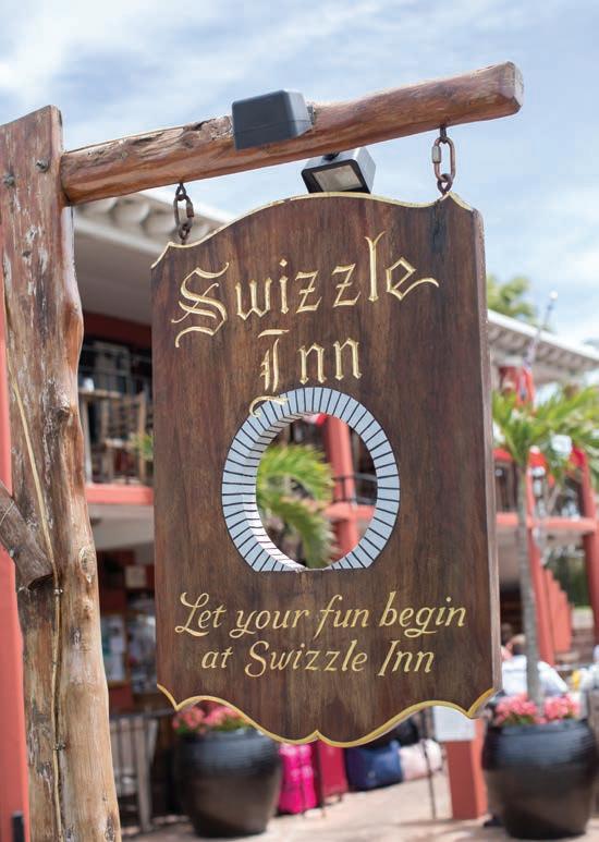 business cards from decades of previous swizzlers. Enjoy a jug of the deliciously potent original Rum Swizzle, Bermuda’s national drink. Then, feast on the awardwinning Swizzle burger, Bailey’s Bay fish sandwich, conch fritters, pizzas, and the best nachos and wings in Bermuda. Other options include local fish, classic pub fare like bangers and mash, and fish ’n’ chips. Stop by for their hugely popular weekend barbecue with slow-smoked ribs, steaks, piri-piri chicken, and luau shrimp. Be sure to leave your card, signed dollar bill, or a message on the pub walls. Kids always welcomed. Check out their gift shop offering a wide selection of Swizzle Inn–Swagger Out clothing and gifts.