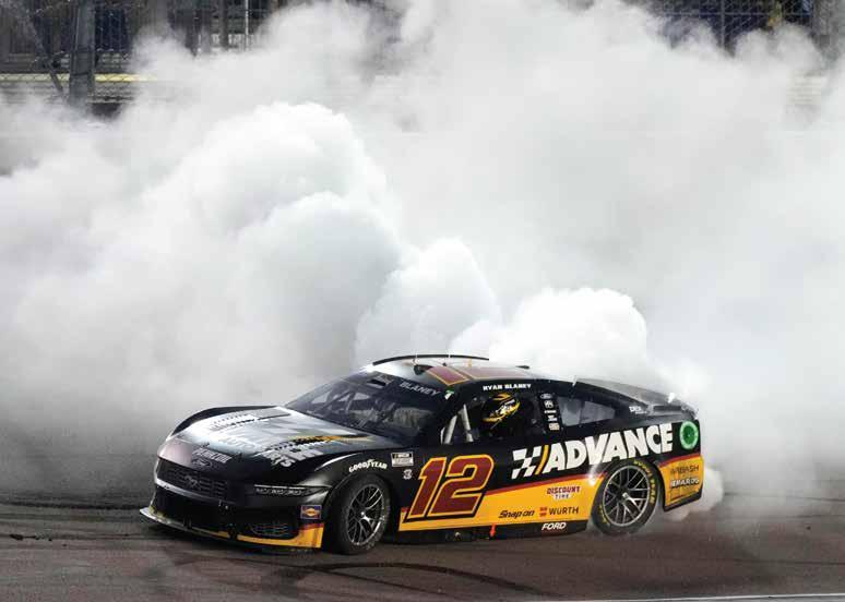 Ryan Blaney does a burnout after winning Sunday’s NASCAR Cup Series race at Iowa Speedway. The win clinched him a spot in the playo s.