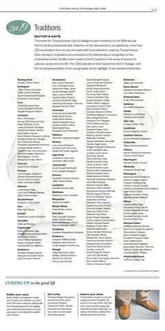Richlands Sallie Lee Sylvester Rocky Mount Margaret Elizabeth Deyton Ann Claire Roberson Rutherfordton Emily Allred Decker Salisbury Ann Rollins Johnson Shelby Rebecca Lutz Burton Victoria Jane Hunter Siler City Lindsay Ashlyn Tate Smithfield Emma Augusta Lampe Southern Shores Anna Catherine Culpepper Statesville Allison McKenzie Beard Tarboro Sarah Catherine Anderson Deanna Scott Mayo Washington Marisa Frances Gerard Whiteville Margaret Stuart High Wilmington Alexandra Britt Creighton Eleanor Gregory Harris Frances Dowling King Katharyn Stuart Loweth Katharine Shephard Efird Sullivan Juliet Marie Taylor Kathryn Graham Tinsley Hannah Nicole Williams Wilson Lauren Hailey Blair Charlotte Parker Daniel Hadlea Elizabeth Finklea Emma Cosby Lantz Elizabeth Darden Smith Emma Cotten Vick Winston-Salem Ruthlee DeArmon Britton Mary Ann Cooper Broughton Olivia Alston DuBose Kerry Elizabeth Eagan Elizabeth Preston Fulton Anne Lillian Myers Anna Elizabeth Nastasi Gwendolyn Sanders Newman Kathryn Sandridge Oldham Anna Schaefer Phillips Wrightsville Beach Catherine Leigh Dull