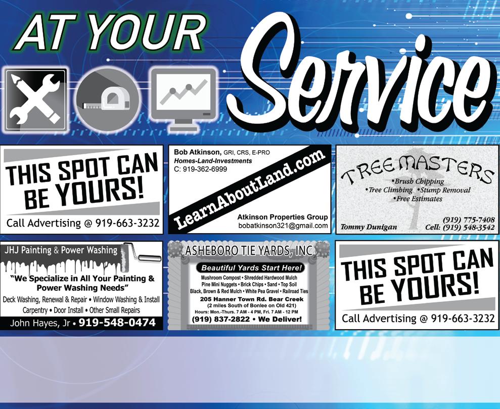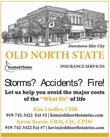 A2 Chatham News & Record for Thursday, May 2, 2024 THIS WEEK’S VIDEO When Should You Offer Above or Below Asking Price? RESIDENTIAL LAND COMMERCIAL IMPROVED COMMERCIAL UNIMPROVED RESIDENTIAL LAND COMMERCIAL IMPROVED COMMERCIAL UNIMPROVED THURSDAY 5.2.24 “Join the conversation” Chatham News & Record www.chathamnewsrecord.com North State Media LLC 303 West Raleigh Street Siler City, North Carolina 27344 Copyright 2024 Neal Robbins, Publisher Jim Sills, VP of Local Newspapers Jordan Golson, Local News Editor Shawn Krest, Sports Editor Asheebo Rojas, Sports Reporter A.P. Dillon, Capitol News Reporter Ryan Henkel, Reporter Bob Sutton, Reporter Jesse Deal, Reporter P.J. Ward-Brown, Photographer BUSINESS David Guy, Advertising Manager The Chatham News & Record (USPS #101-160) is published weekly, 52 weeks a year, by North State Media LLC, 303 West Raleigh Street, Siler City, N.C. 27344. N.C. POSTMASTER Send address changes to The Chatham News & Record, PO Box 290, Siler City, N.C. 27344 CONTACT US For a vacation hold or to report a delivery problem: 919-663-3232 To place a classi ed or display ad: 919-663-3232; Fax: 919-663-4042 To submit a news tip or correction: 919-663-3232; email: news@chathamnewsrecord.com SUBSCRIPTION RATES Subscription rates begin at $6.58/ month (1 year print & digital, paid annually) or $4.92/month (digital only, paid annually). Pick your plan at www. chathamnewsrecord.com/subscribe. Auto-renew; cancel anytime #37 SPONSORED BY Here’s a quick look at what’s coming up in Chatham County: