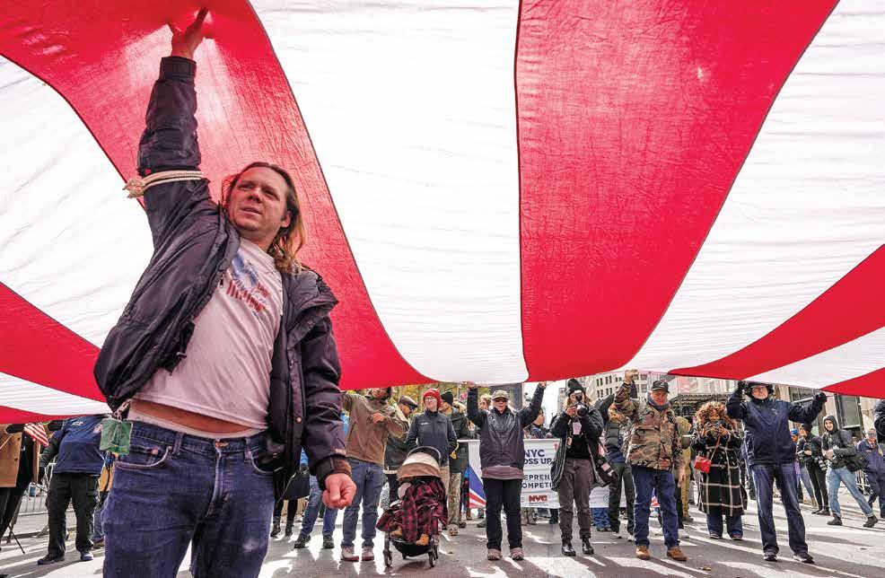 Participants raise an American ag during the Veterans Day parade Tuesday in New York.