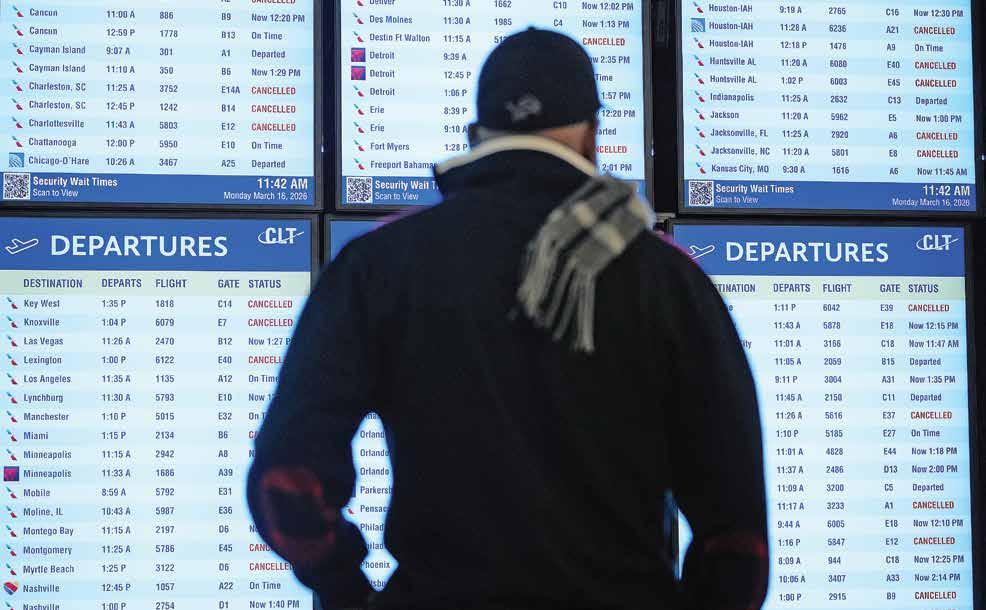 A person looks at the departure board with multiple ight cancellations at Charlotte Douglas International Airport on Monday as a swath of storms caused travel chaos and canceled schools across the state. The system triggered tornado watch alerts in the Piedmont, but the storm was limited mostly to strong winds and rain.
