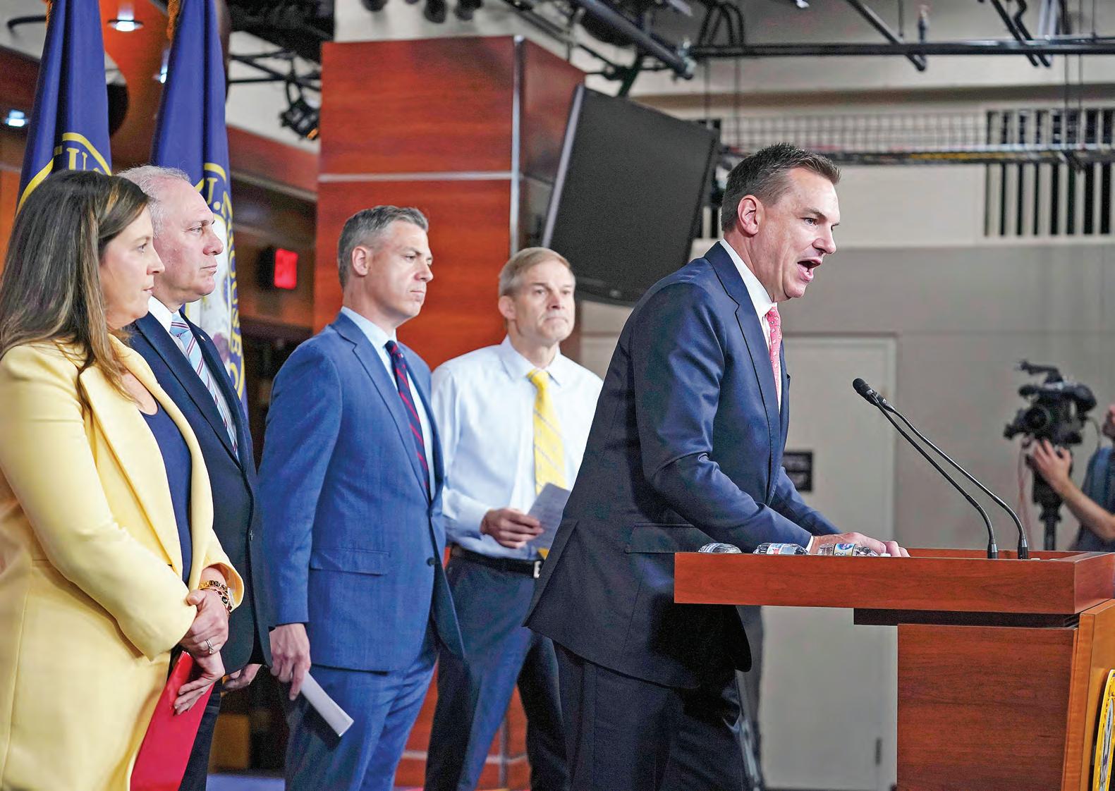 From left, House Republican Conference Chair Elise Stefanik, R-N.Y., House Minority Whip Steve Scalise, R-La., Rep. Jim Banks, R-Ind., Rep. Jim Jordan, R-Ohio, and Rep. Richard Hudson, R-N.C., speak to reporters following a Republican Conference meeting at the Capitol in Washington, D.C., Wednesday, June 8, 2022.