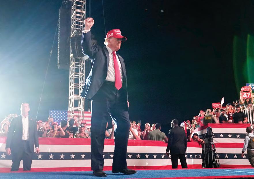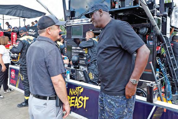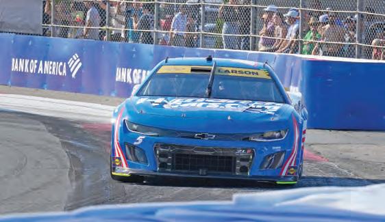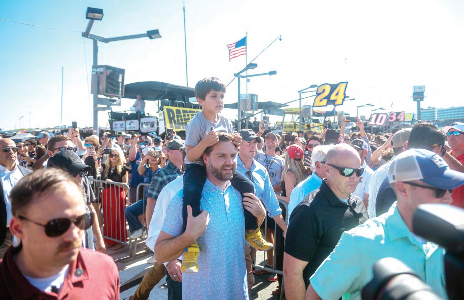 Sen. JD Vance carries his son Vivek on his shoulders while walking to pit row during a visit to Charlotte Motor Speedway before Sunday’s NASCAR Royal 400 in Concord. Kyle Larson snagged his sixth victory of the season at the Roval. For more, turn to Page B1.