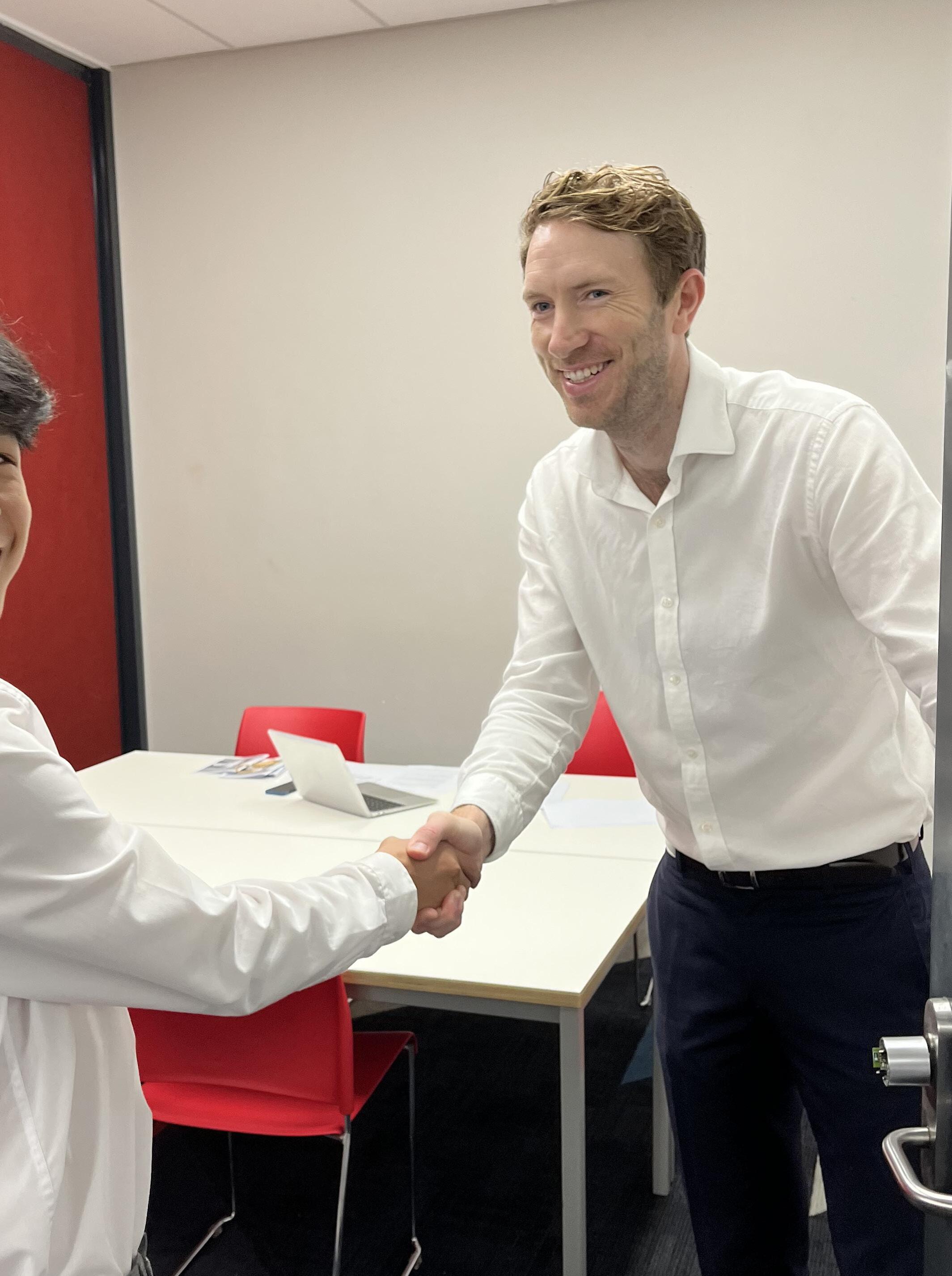 On Friday 8 March, all students in Year 10 participated in a mock interview as part of their compulsory Stage 5 PDHPE studies. This task forms part of the ‘Getting Life Ready’ unit of work. Through a simulated interview scenario, the assessment prompted students to reflect deeply on personal development and resilience and foster readiness for real-world situations, including the transition to part-time or full-time employment. Students developed their competence in analysing their own and sense of self and assessing their ability to reflect on and respond positively to challenges. In addition, they learnt about the significance of effective communication and self-presentation in a professional setting. The attached photos show Mr Murphy, playing the role of employer, greeting a Year 10 student for his mock interview.