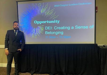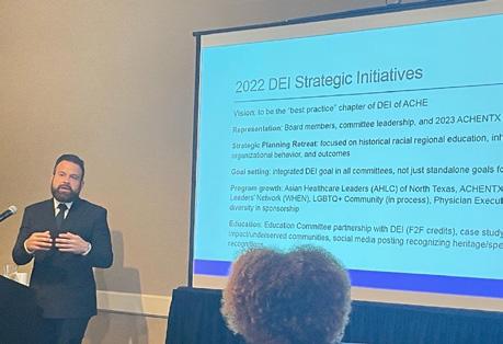 bringing this innovative idea to our team and executing its creation. Also, in our inaugural Executive Connection issue this year, we discussed our goal to become the best practice chapter for diversity, equity, and inclusion (DEI) in the United States. Through the leadership of our board, committee leadership, and our members, I am honored to declare that we achieved this. The week prior to penning this message, ACHE National asked us, ACHENTX, to present our DEI best practices at the ACHE Chapters Leaders Conference 2022 with the hope that our model could be shared across all chapters. I was so proud of the recognition our chapter’s leadership and culture received, but, more importantly, it was rewarding to share a framework that could be replicated across the United States to, “Create a Sense of Belonging,” in other chapters and organizations across the nation.