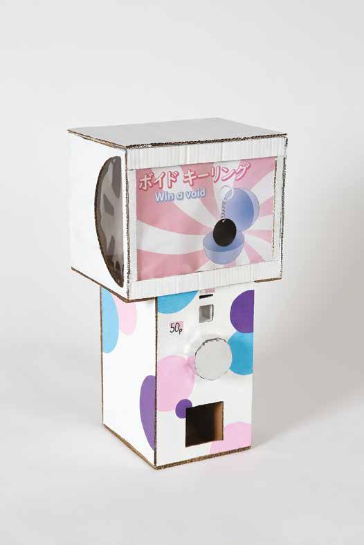 ガチャちゃん (Pronunciation: Gacha Chan, Translation: Miss Gacha) Cardboard, acetate sheets, acrylic paint, plastic ball, paper, bamboo skewer, hot glue, acrylic disc, metal keyring