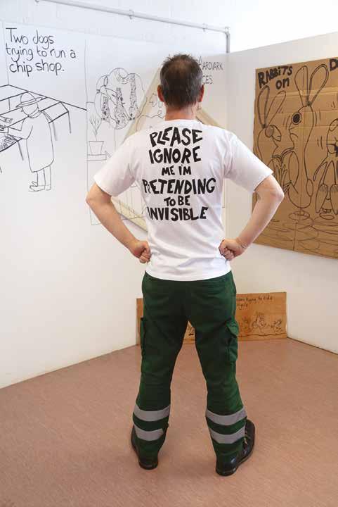 Above: Please Ignore Me White T-shirt, black fabric paint, leather clown shoes