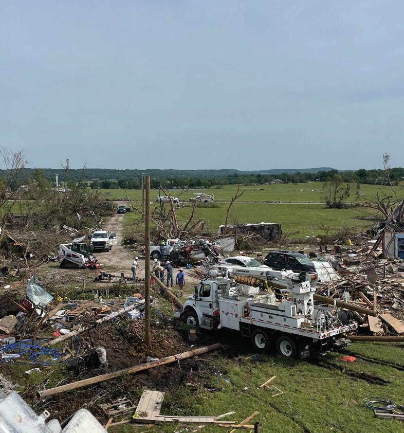 | Below: NWEC sent mutual aid crews to help restore power to members of Verdigris Valley Electric Cooperative in Northeast Oklahoma following tornados that devastated portions of their service territory in late May 2024. Photos provided by NWEC Lead Lineman Tyler Simpson.