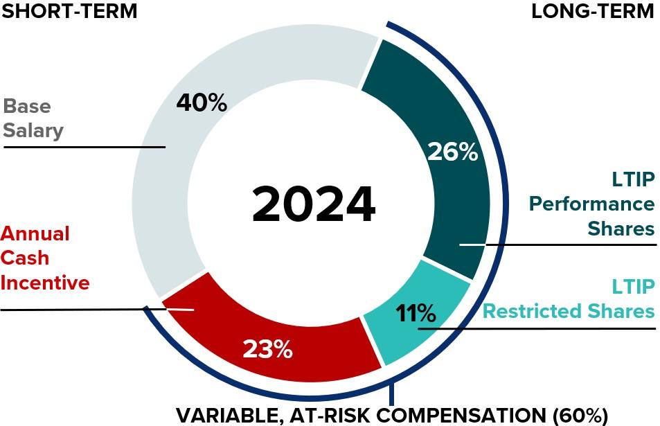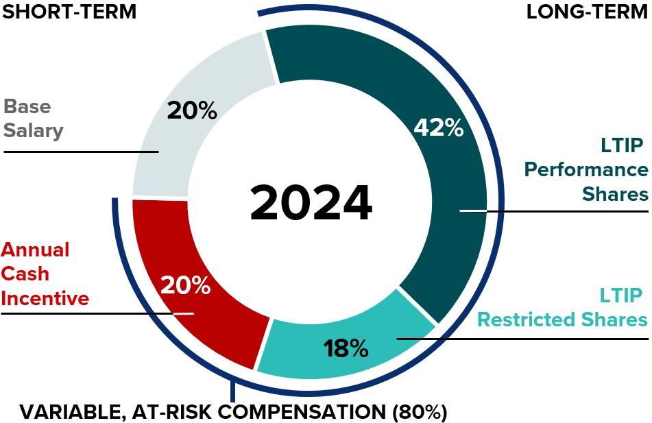 The performance-based incentive awards and time-based equity award place a significant percentage of executive compensation at risk — approximately 80 percent of the compensation of our chief executive officer (CEO) and roughly 60 percent of the compensation of our other named executive officers (NEOs). Our Board establishes the metrics and targets for these incentive awards based on advice from the Compensation Committee’s independent compensation consultant, Towers Watson. The 2024 LTIP performance metrics did not change from 2023, although we did update the targets associated with those metrics.