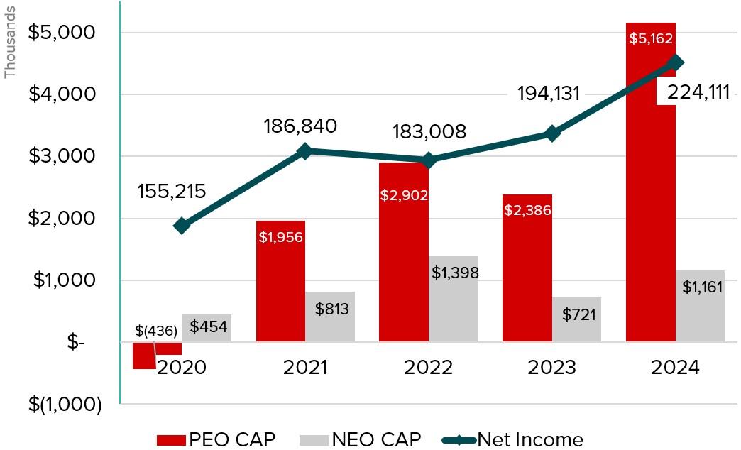 Based on the information in our pay versus performance disclosure, beginning on page 59, the CAP (compensation actually paid) to our CEO and other NEOs in 2024 was more than the compensation disclosed in the Summary Compensation Table. CAP appears to correlate with certain measures of corporate performance — CAP appears to increase or decrease with increased or decreased TSR, which is not surprising as a third of our LTIP awards are tied to relative TSR. However, CAP does not appear to correlate with certain other measures of corporate performance — CAP increased and decreased from year to year even though net income consistently increased, and our supplemental Company selected metric (three-year ROAE) remained relatively flat. This result also is not surprising because these metrics represent a smaller percentage of our incentive compensation.